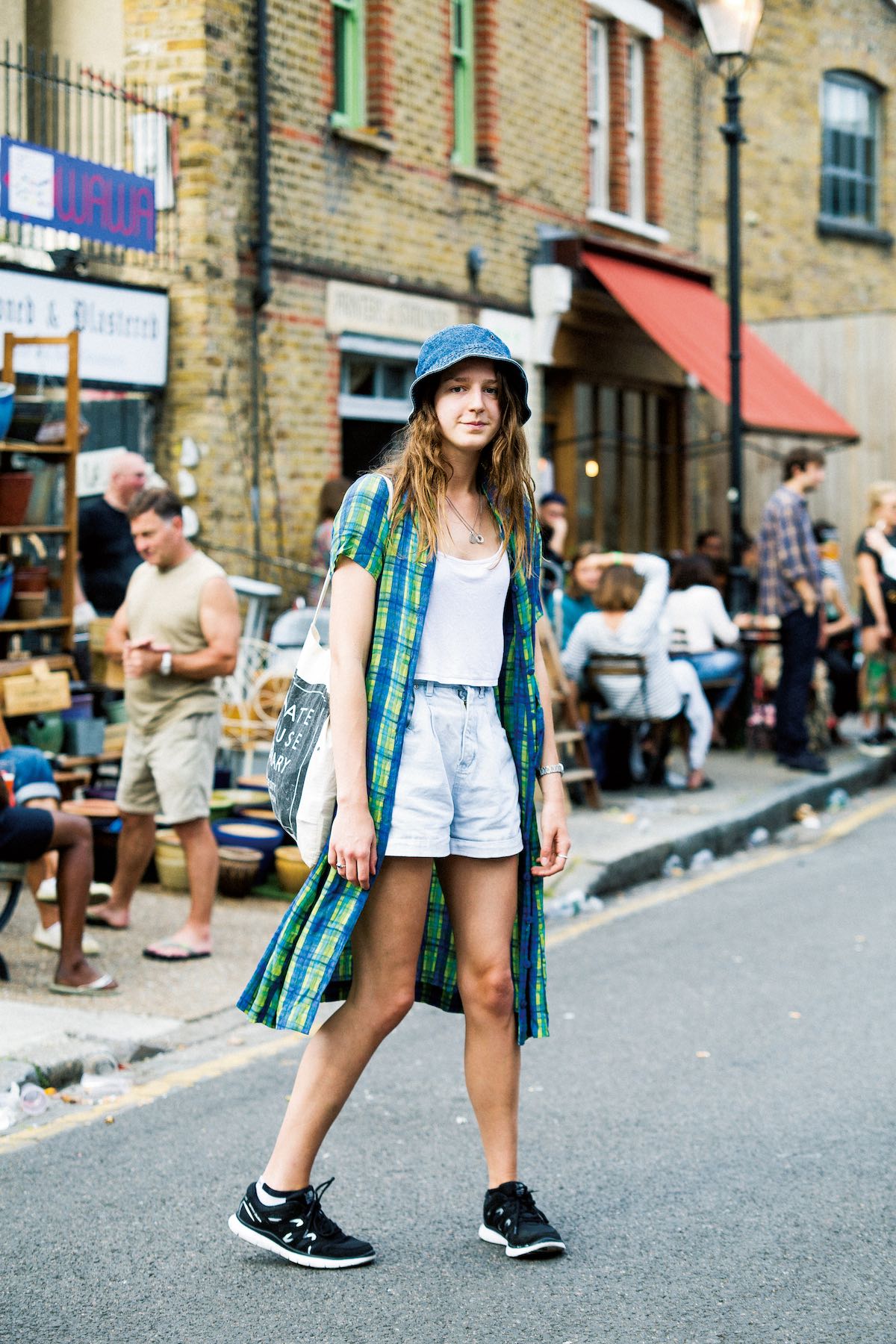 タンクトップにショーツという、とことんラフな格好に羽織った、マドラスチェックのシャツワンピースが最高に爽やか。思い切り夏を謳歌したい日は、ぜひ彼女の装いを参考に。