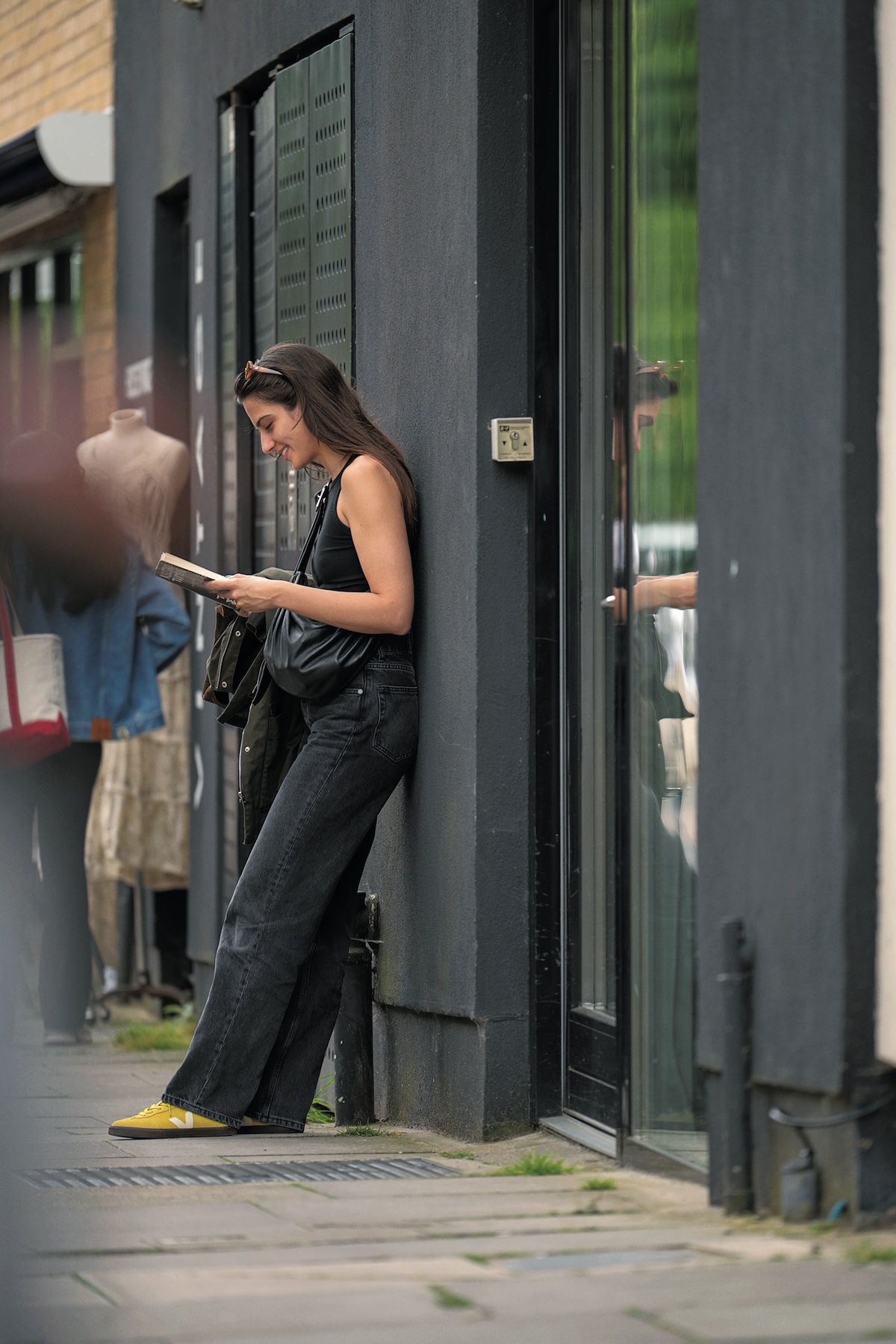トップス、デニムパンツ、バッグまで、すべてブラックで統一したスタイリッシュなサマースタイル。それぞれ異なる素材感のアイテムが組み合わさっているから、オールブラックでも不思議と軽やかな仕上がり。スニーカーのイエローも好アクセント。
