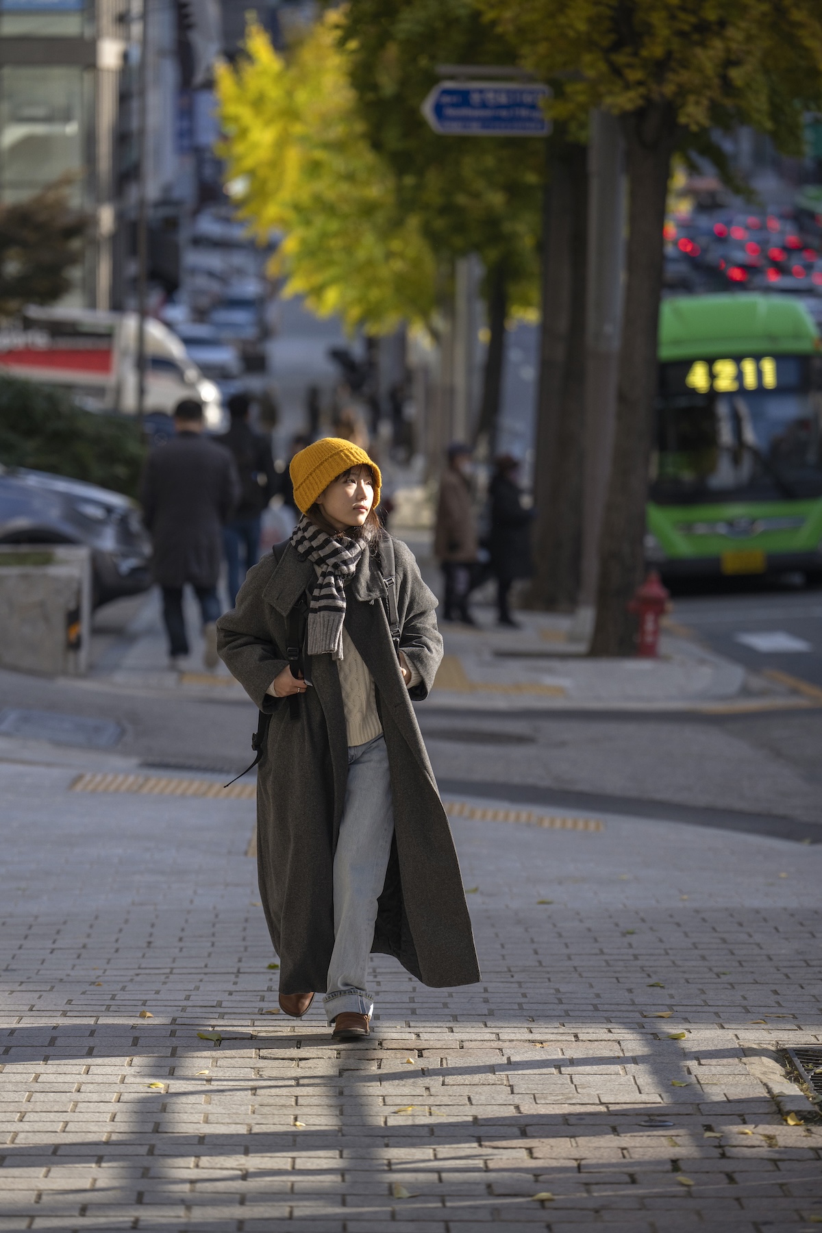 セーターとデニムパンツは淡色、ロングコートは濃いめダークグレー。明暗でメリハリをつけたコーディネートをよりお洒落に映すのは、挿し色で使ったニットキャップの存在によるもの。