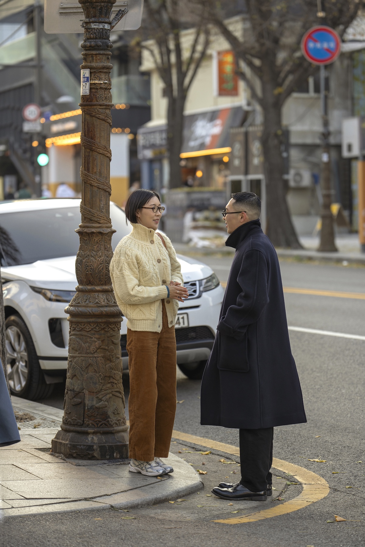 繊細な編みが目を引く厚手のカーディガンが主役。ダークブラウンのコーデュロイパンツを合わせてクラシカルな雰囲気をつくりつつ、足元のスニーカーでハズしたテクニックが実に小粋です。