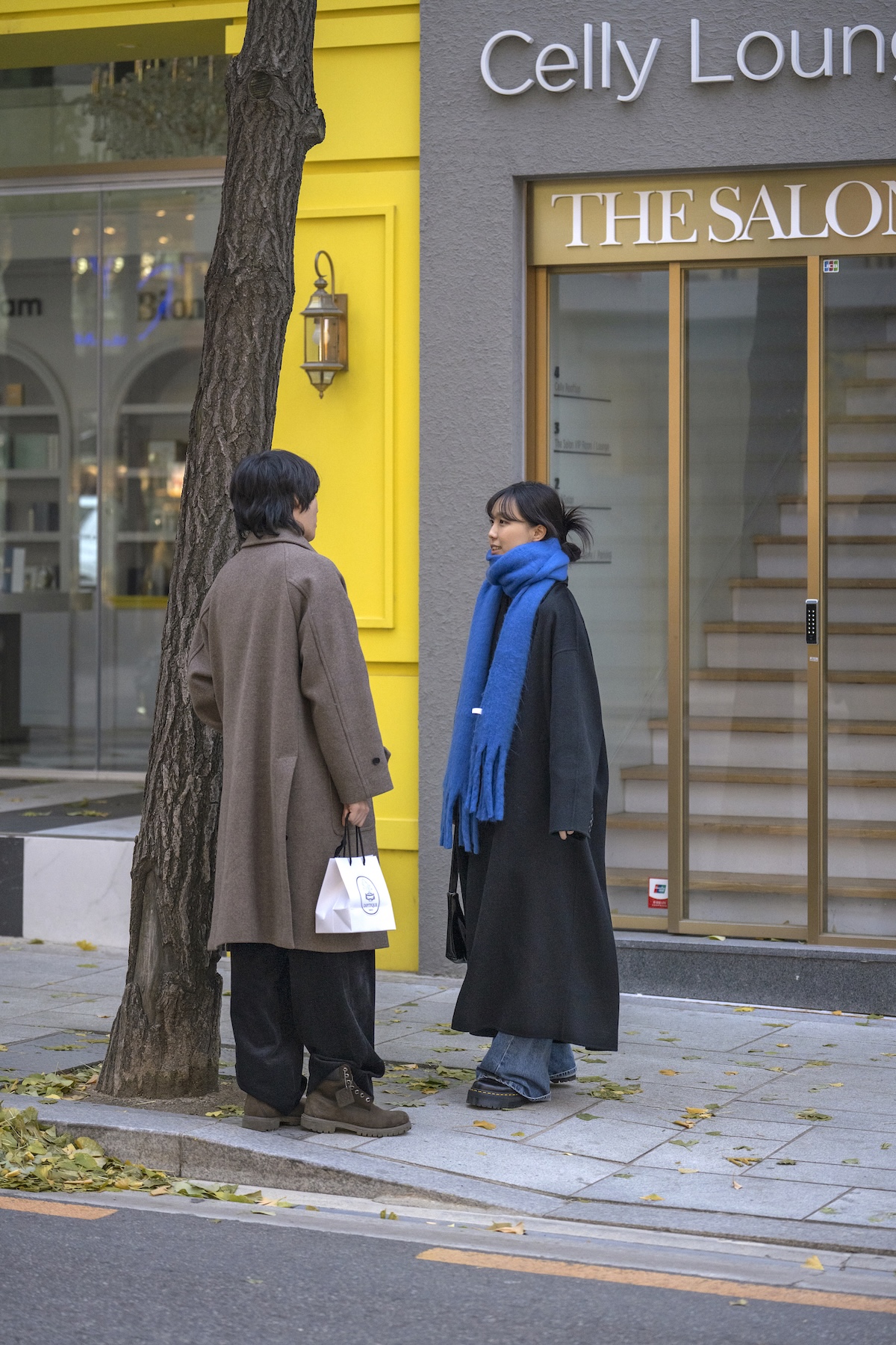 ストンと綺麗におちたロングコートとフレアパンツの合わせがとってもお洒落。でも最大のポイントはぐるぐるに巻いた鮮やかブルーの大判マフラー。これだけでぐっと冬感は生まれるのです。