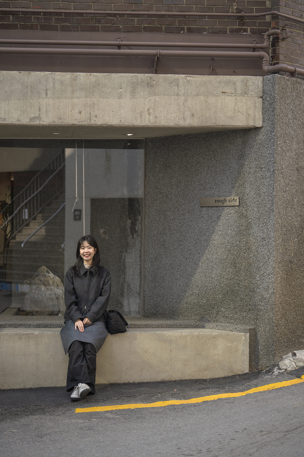 コート/rough side、パンツ/GU、シューズ/adidas、バッグCOS