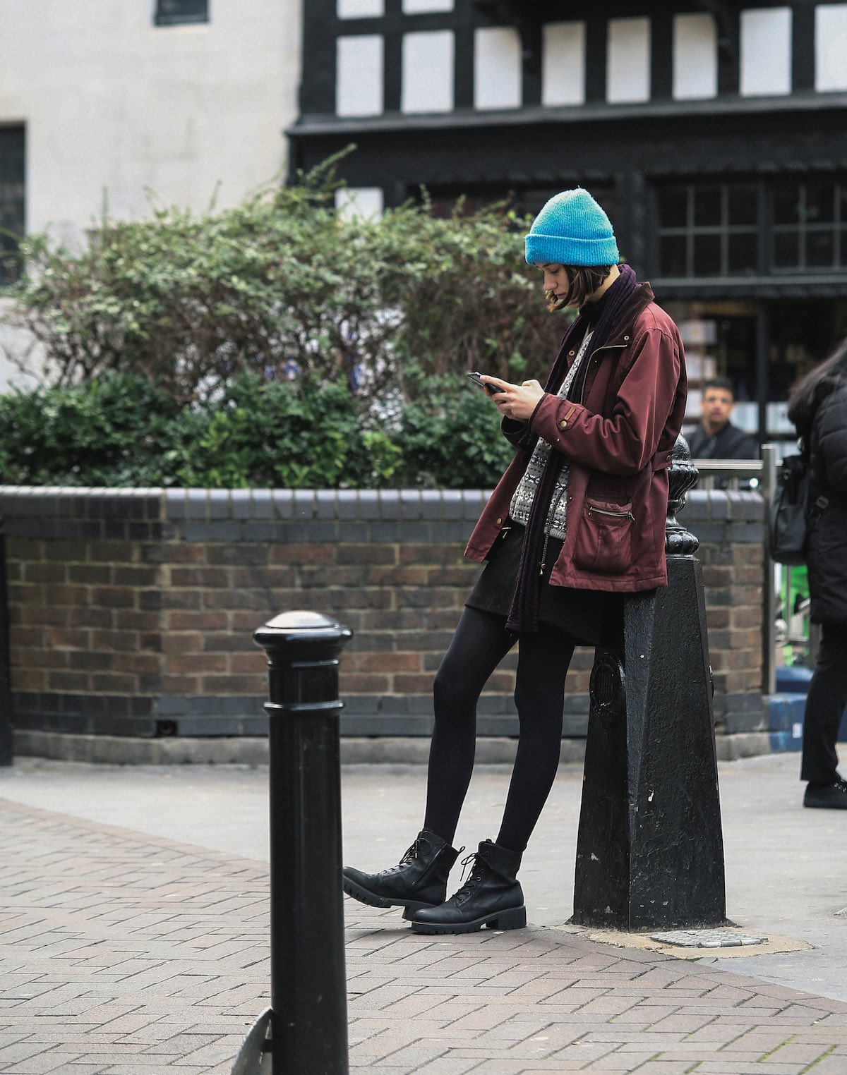 リージェントst. にて絶賛ランチ迷子のアンナは、ルーズなジャケット×ミニスカート、ブルー×ボルドーと互いを引き立てる組み合わせが上手い。美味しいご飯にありつけますように。
