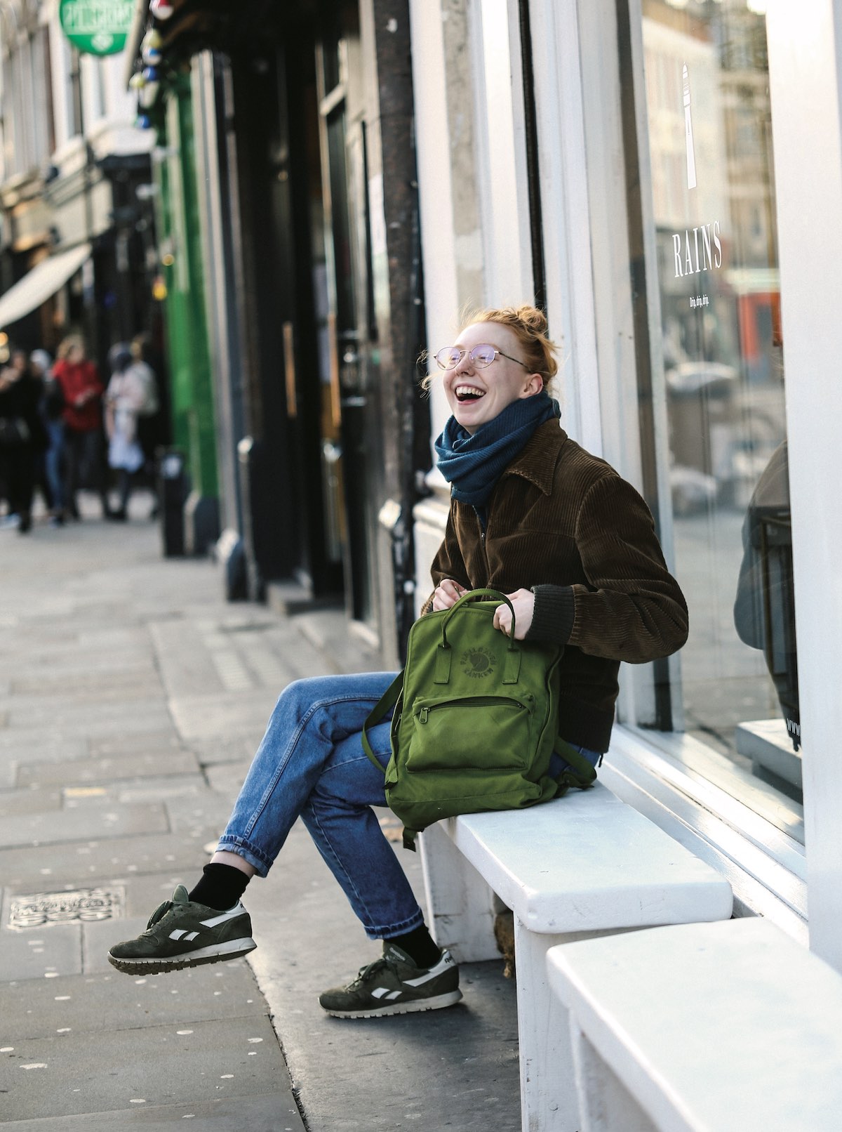 アウター/Vintage、パンツ/TOPSHOP、シューズ/Reebok、バッグ/FJALLRAVEN