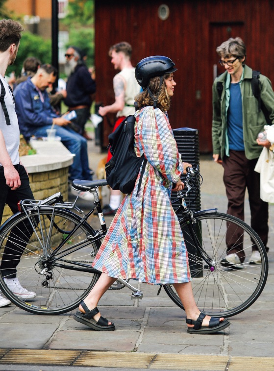 こんなにも飾らずにワンピースを着こなせたなら……! そう思わせてくれる彼女の装い。甘いワンピースとは相反するバックパックとヘルメットがいいスパイスとなり、愛車との2ショットをいっそう魅力的に映す。