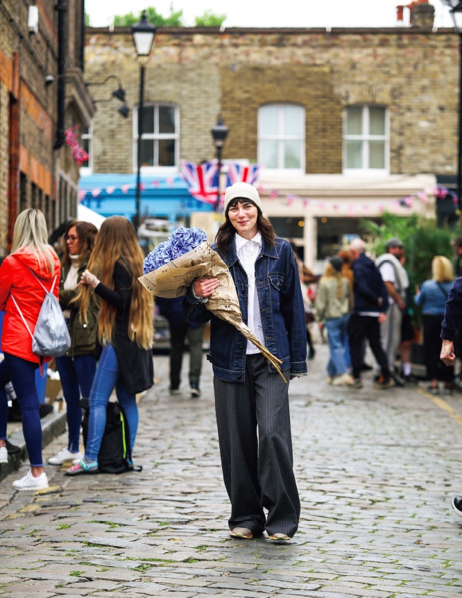じんわりと色づく紫陽花が似合う、少し肌寒い曇り空の日曜日。ナチュラルな雰囲気を醸すヴィンテージのブラウスとデニムジャケットのレイヤードを、ストライプのスラックスで引き締めてハンサムの薫る着こなしに。