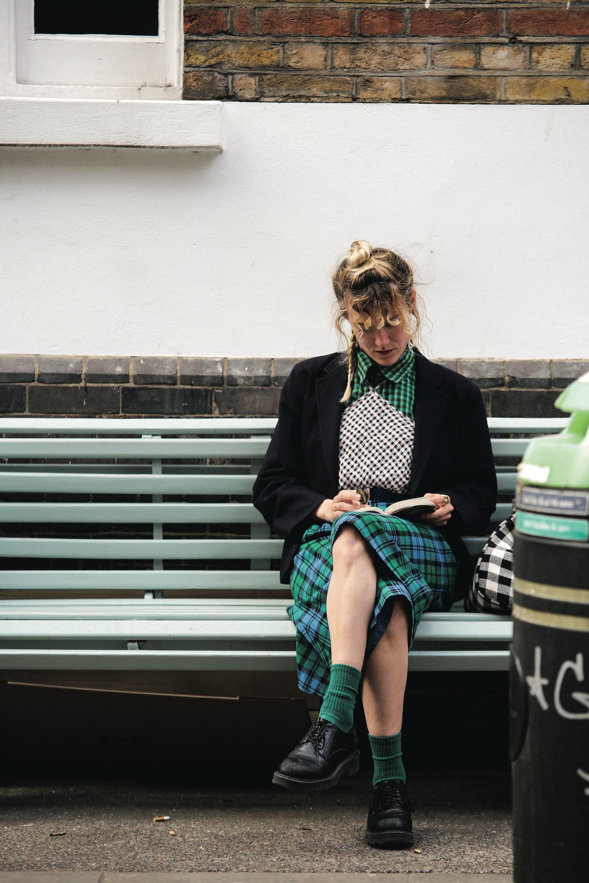 シャツ、キャミソール、パンツ、バッグ……すべてチェック柄! 彼女から学ぶ“柄×柄”を成功させるポイントは、色数を抑えること。さらに紺ブレザーを重ねて、全体をつなぐまとめ役に。