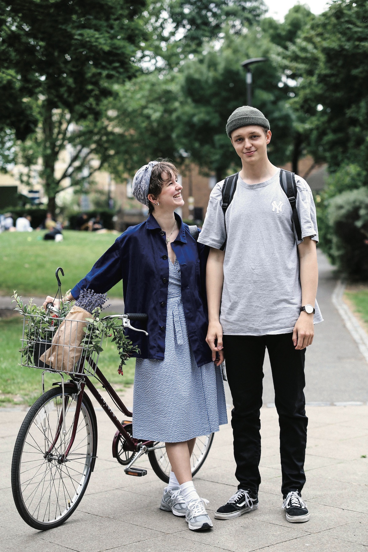 ジャケット、頭に巻いたスカーフ/ともにVintage、ワンピース/Rude、バッグ/HAY、シューズ/New Balance