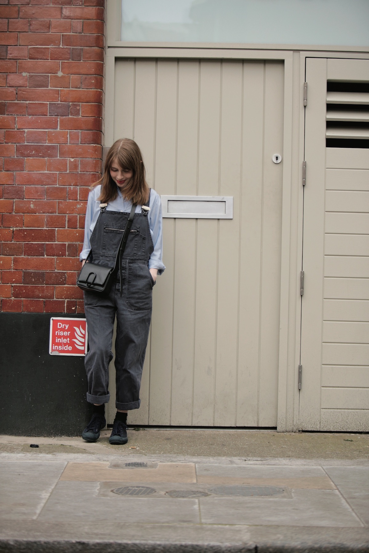オーバーオール、シャツ/ともにMHL.、バッグ/3.1 Phillip Lim、スニーカー/STUDIO NICHOLSON
