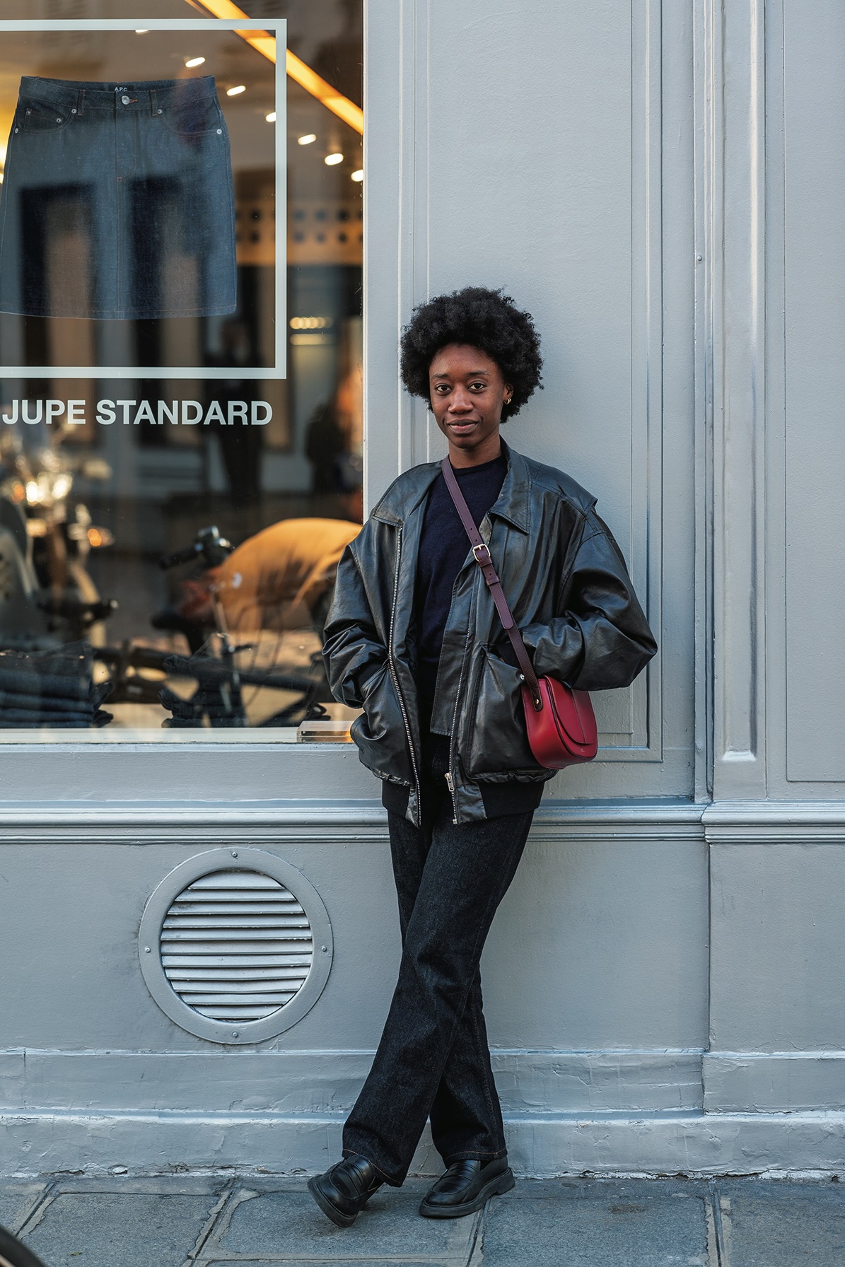 メンズライクなレザージャケットをシックに着こなしたケニア。まあるいシルエットのナチュラルアフロへアがかわいい! 控えめなピアスと赤のバッグで品よくまとめているのも印象的。