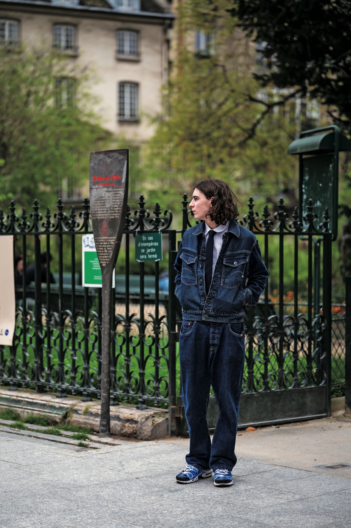 緑に囲まれたドゥ・トンプル広場前で待ちぼうけをくらう、グッドルッキングガイをパシャリ。無骨なデニムonデニムにシャツ&タイを忍ばせ、トラッドなムードを醸し出す。