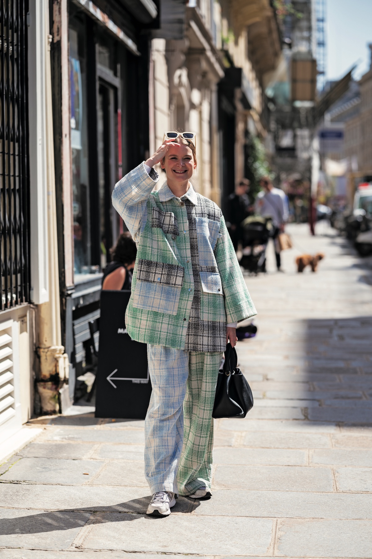 ジャケット、パンツ/ともにStella Nova、サングラス/ANINE BING、バッグ/Polène、スニーカー/New Balance