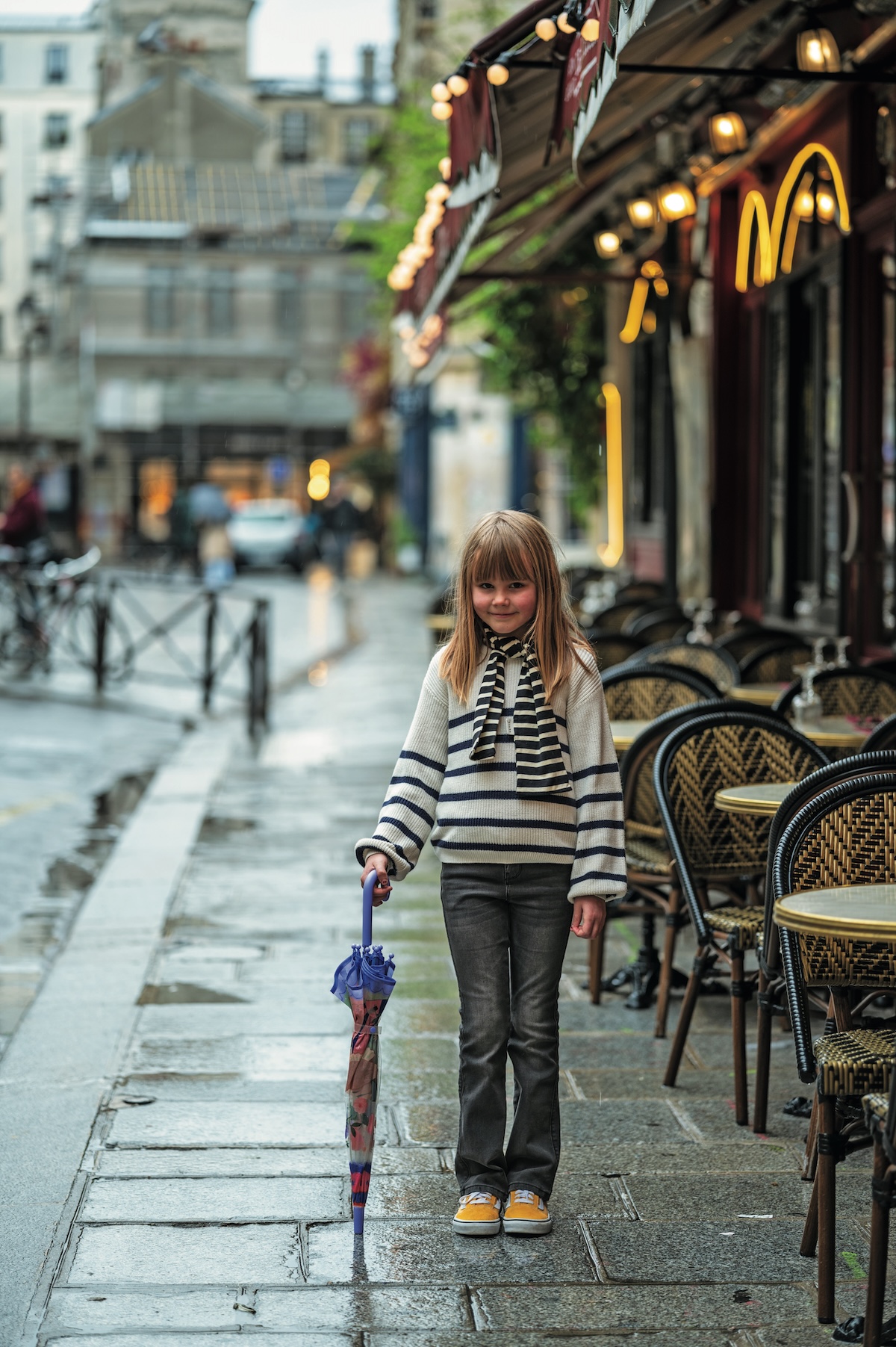 スウェーデンからママと旅行に来ていた小さなファッジガールをキャッチ。首に巻いたストールはグランマのブランドのもの。リズムの異なるボーダー合わせ、参考になります。