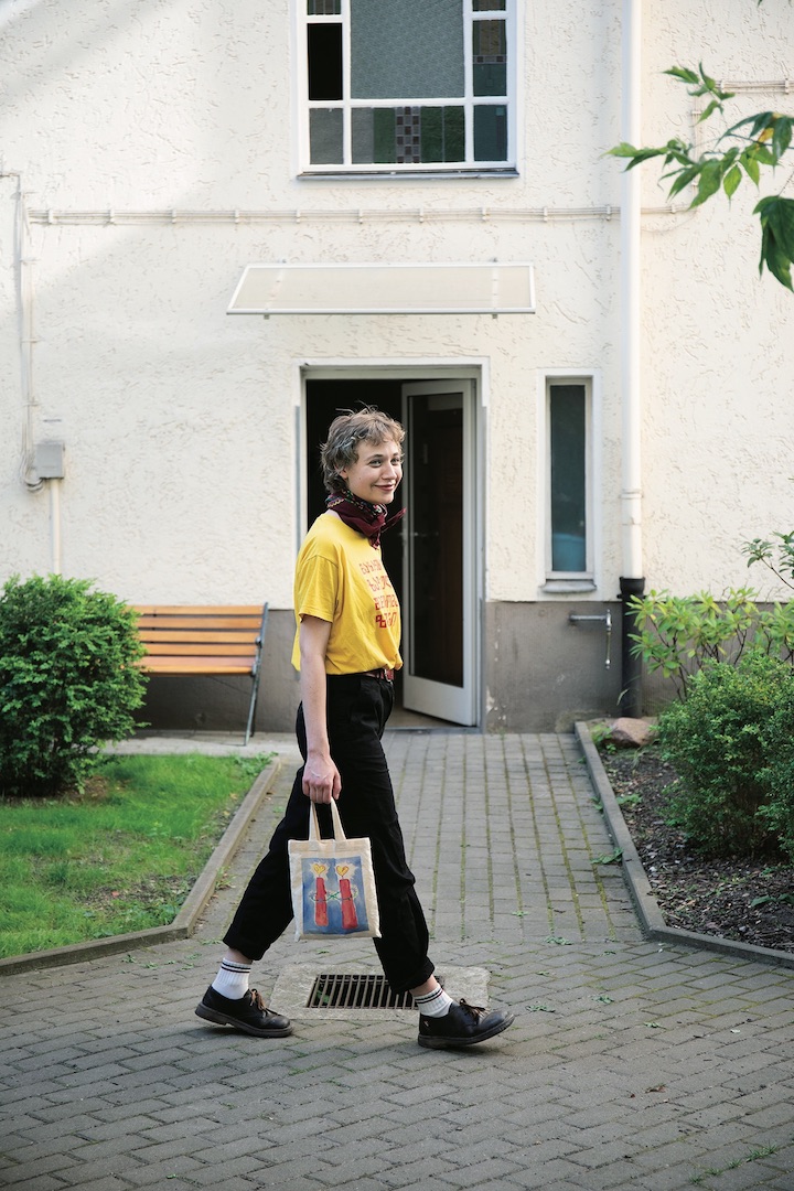 Tシャツ/Vintage、パンツ/Carhartt WIP、ソックス/American Apparel、シューズ/Duckfeet、バッグ/ハンドメイド、スカーフ/unknown