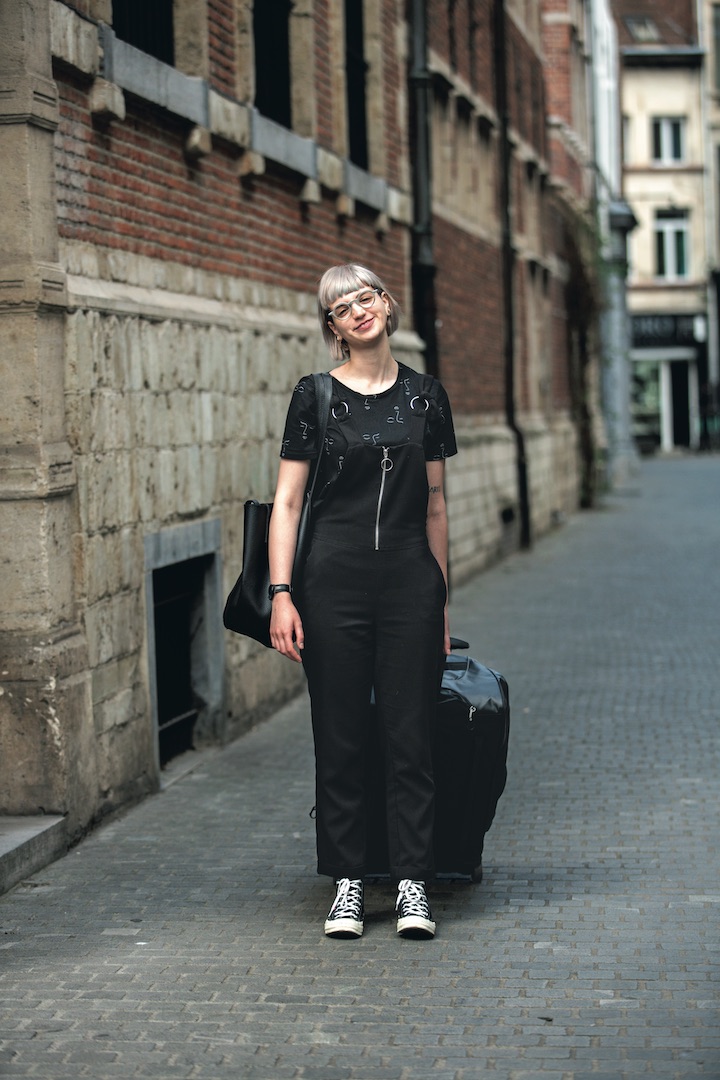 トップス/ZARA、オーバーオール/MANGO、メガネ/theo、キャリーバッグ/Samsonite、シューズ/PLAY COMME des GARÇONS