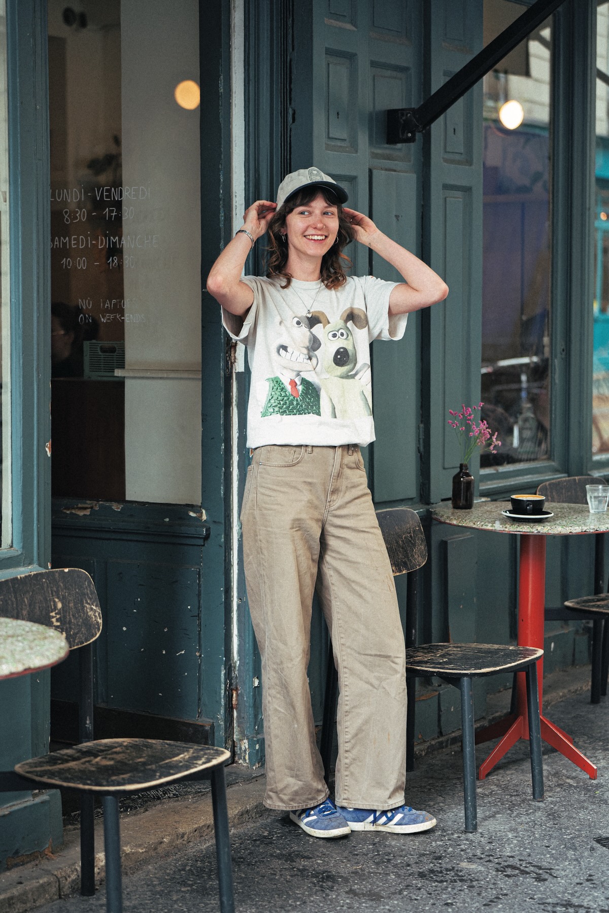 アメリカの大人気コメディーアニメ『ウォレスとグルミット』のファニーなT シャツを纏う彼女。主役を目立たせるべく、他はなるべくシンプルに。キャップにスニーカー、デニムパンツを合わせたボーイな雰囲気もベストマッチ。