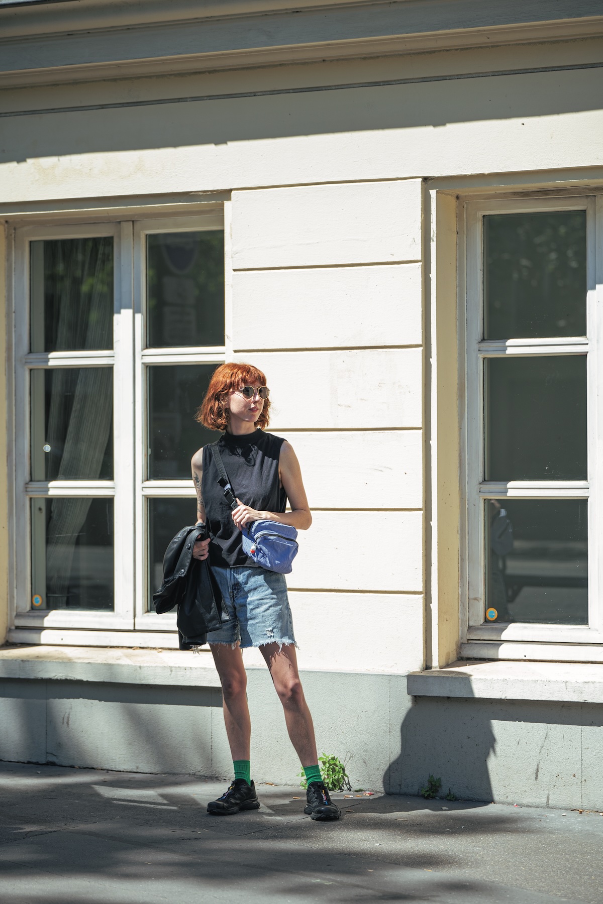ボディバッグ/ BAGGU、タンクトップ/Vintage、デニムショートパンツ/Vintage LEVI’S、ジャケット/Aritzia、サングラス/Ray-Ban、スニーカー/Salomon