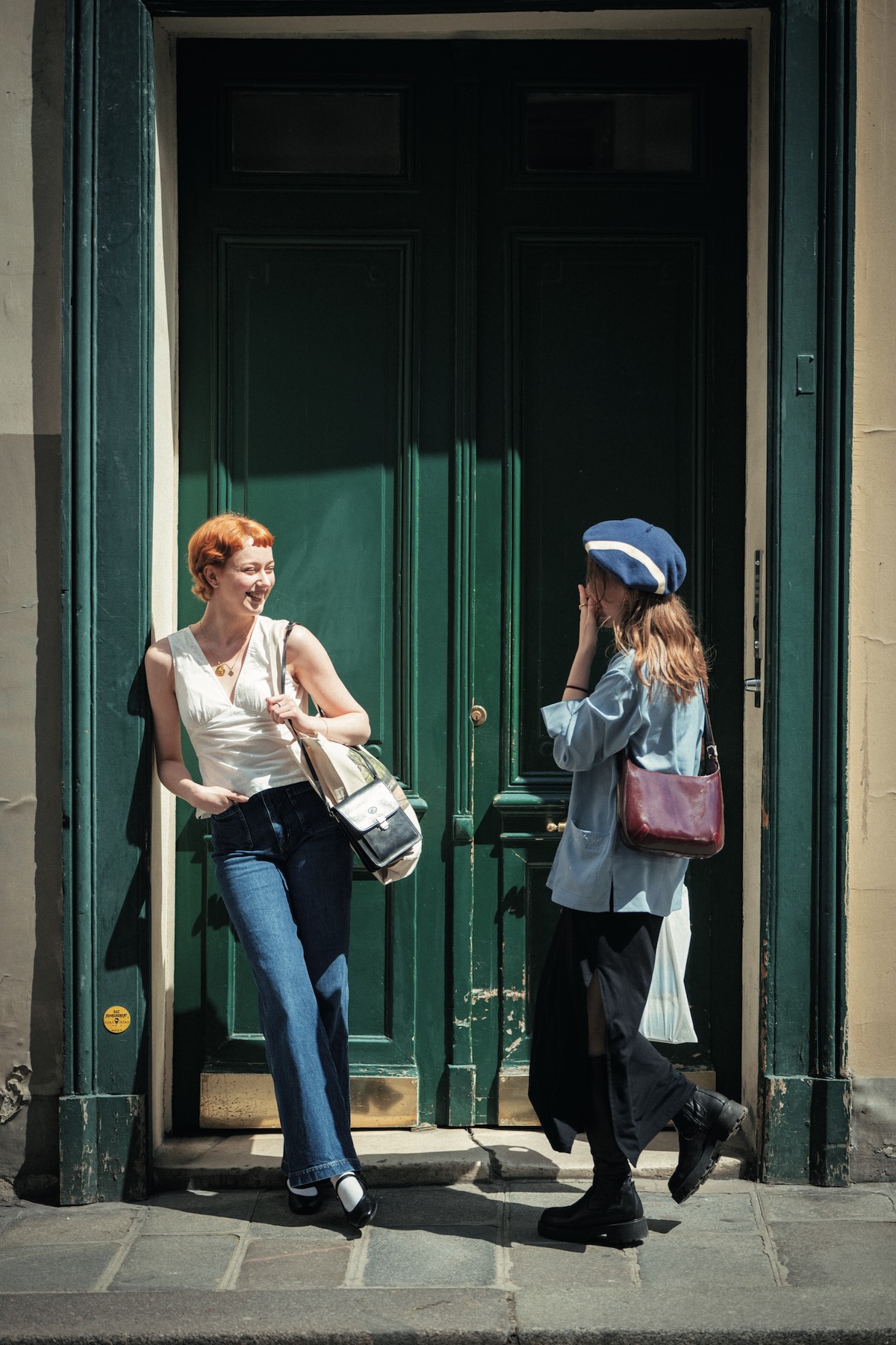 空を覆っていた雲もどこかへ消え、太陽が顔を出したお昼すぎ。「あの緑のドアのところで待ち合わせね! 」そんな約束で集まった今日は、2人でショッピングをする日。さっきまで着ていたフーディをトートバッグにしまってすっかり夏の装いのメリッサと、ベレー帽でお洒落したヘスケは、公私ともによき相棒。グラフィックデザイナーとして互いを刺激し合いつつ、悩みを共有したり、くだらない話で盛り上がったり……一緒に過ごす休日が、2人にとっての充電時間。