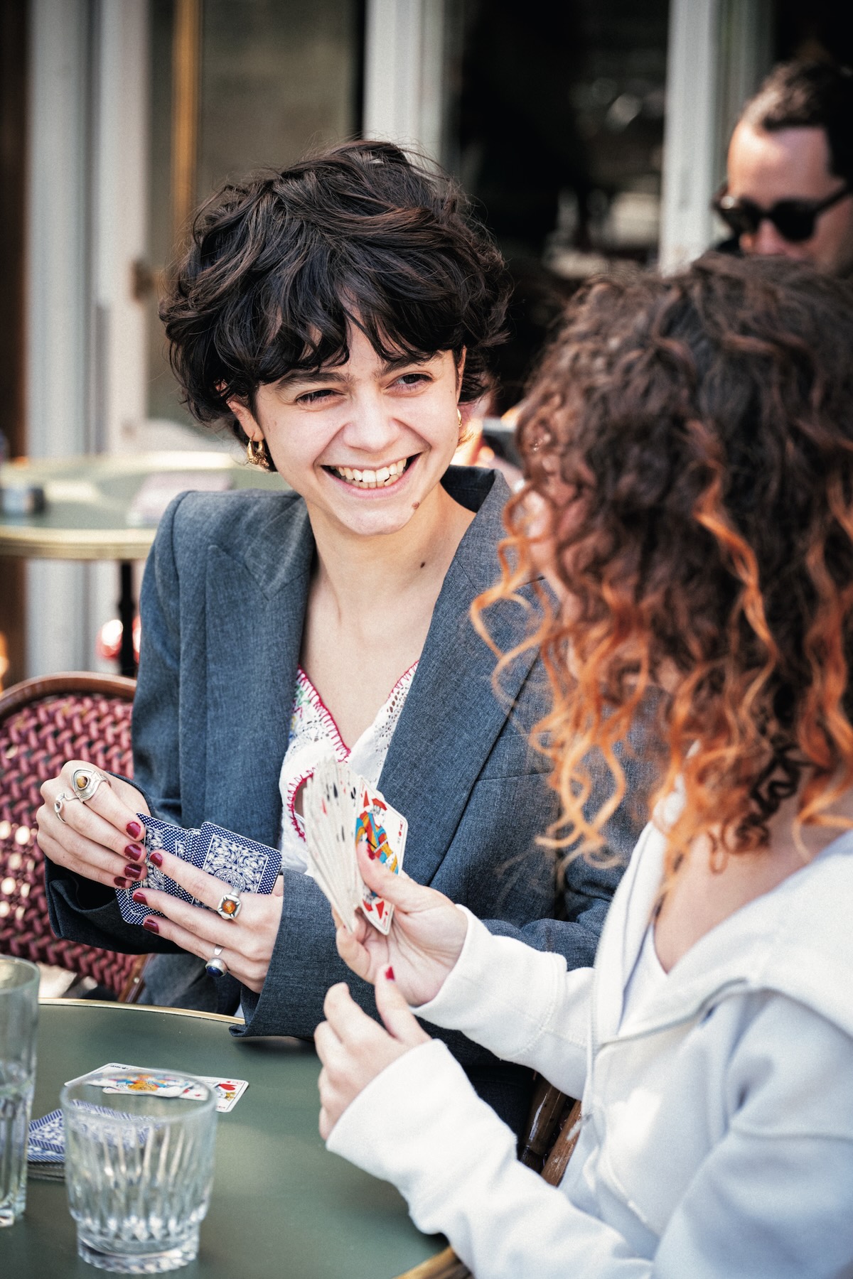 大きめジャケットでマニッシュな着こなしを楽しむ、ショートカットがトレードマークのLucie。真っ赤なネイルと指輪、そしてトランプが、彼女の手元を楽しげに演出する。
