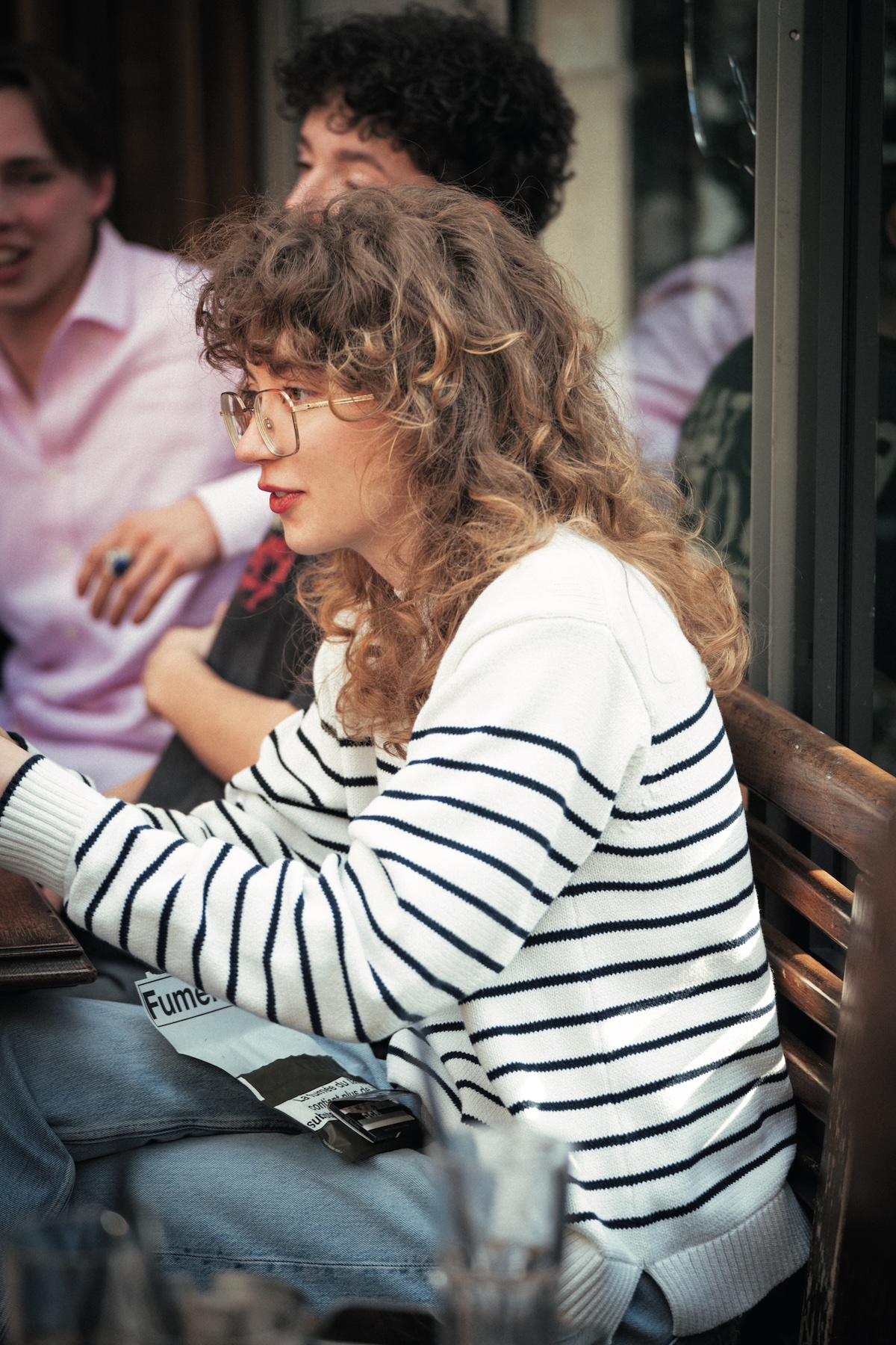 ボーダーカットソーを赤いリップでレディに着こなす様は、まさにパリジェンヌ。前髪までくるくるのカーリーヘアと金縁メガネがミニマムな装いに愛嬌を添えて、彼女の魅力を最大限に際立てる。