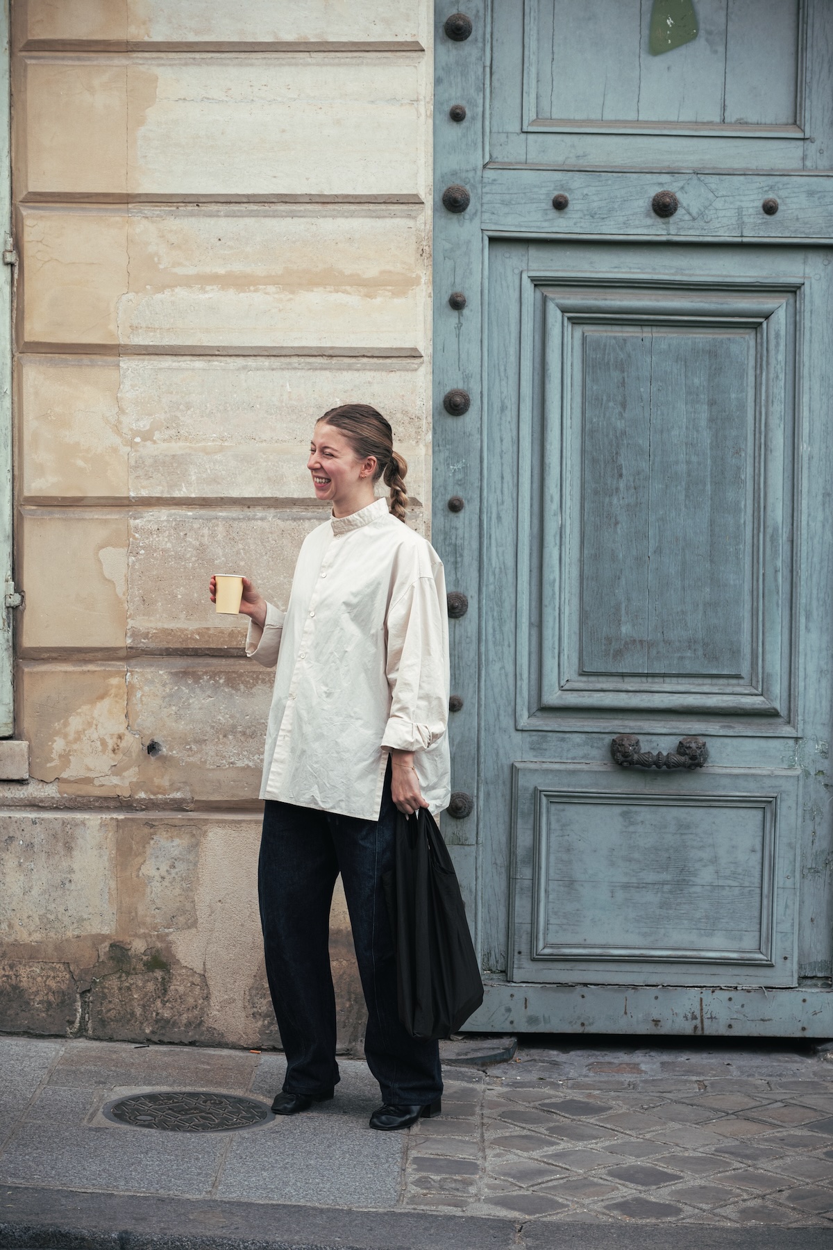 ゆるめのシルエットを生かした着こなしは、男女問わずフランス人の得意とするところ。肩肘張らず、それでいて上品だからさすが。フレンチブランド《ルメール》のシャツを主役にした、潔いシンプルさが好印象。