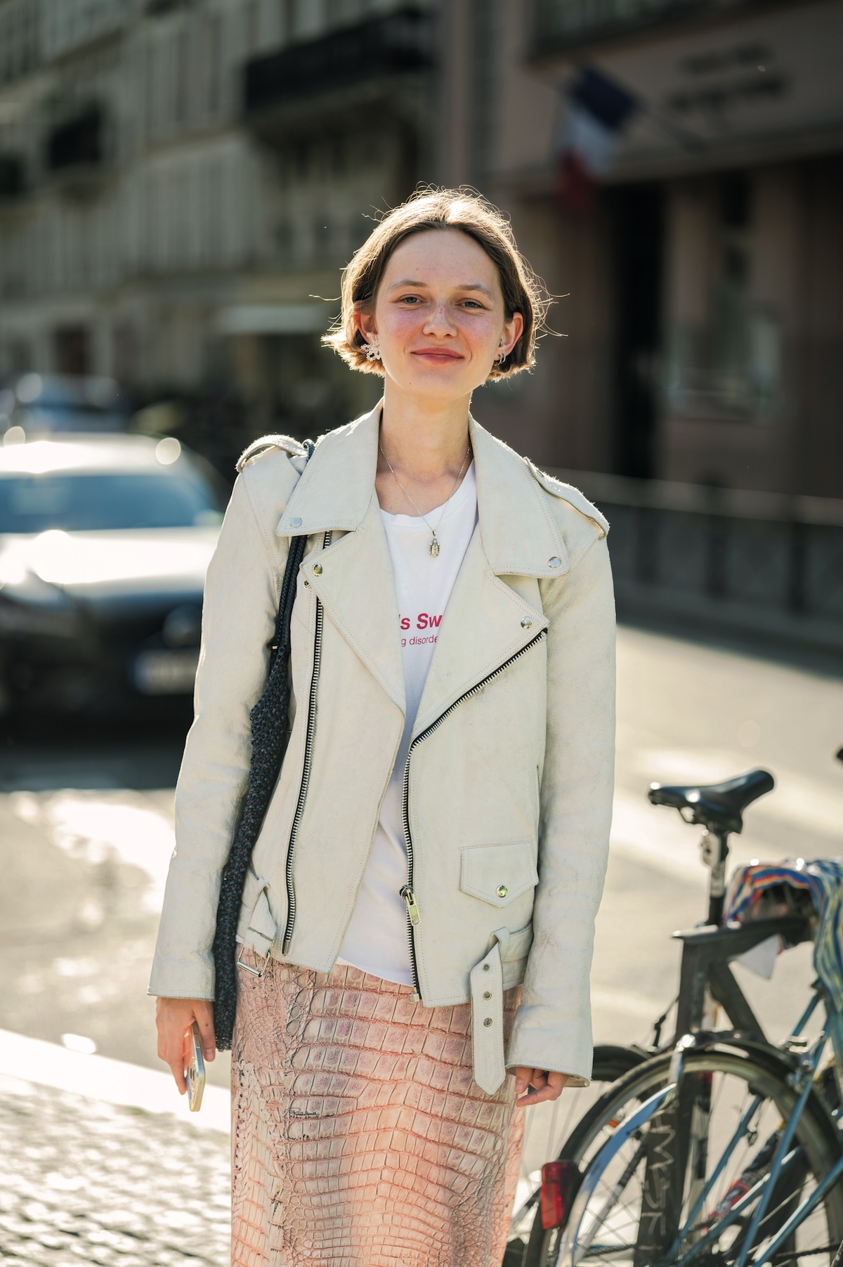 白いライダースジャケットに透け感のあるクロコダイル柄プリントのスカートを合わせるお洒落上級者。ピンクのロゴ入りTシャツで装いに抜け感をつくっているのもお見事です。モデルやスタイリストなど、ファッション関係の仕事をしていると聞いて納得。さらに、マーケティングを学ぶために、ロシアからパリに来たばかりの学生でもあるのだとか! 好奇心旺盛で勉強熱心、加えてセンスも抜群なAnoukがパリの業界で活躍する日も近い!