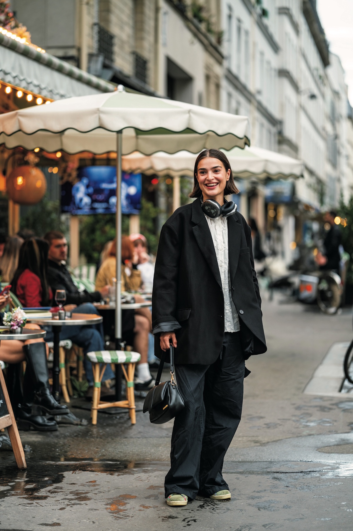 本日は日曜日、時刻は午後7時ごろ。「バイバーイ! 明日からまた頑張ろうねー! 」と明るい声が聞こえてきて振り返ると、カフェの店先にDilaraの姿。久しぶりに集まった友達とお別れをしたところだった。メンズライクなオーバーサイズのジャケットとパンツ、ガーリーなレースブラウス、レディなブラックレザーのハンドバッグといった、さまざまなテイストのアイテムをミックスしているけれど、白と黒のモノトーンで合わせている(靴以外)から絶妙なバランスで整っている。