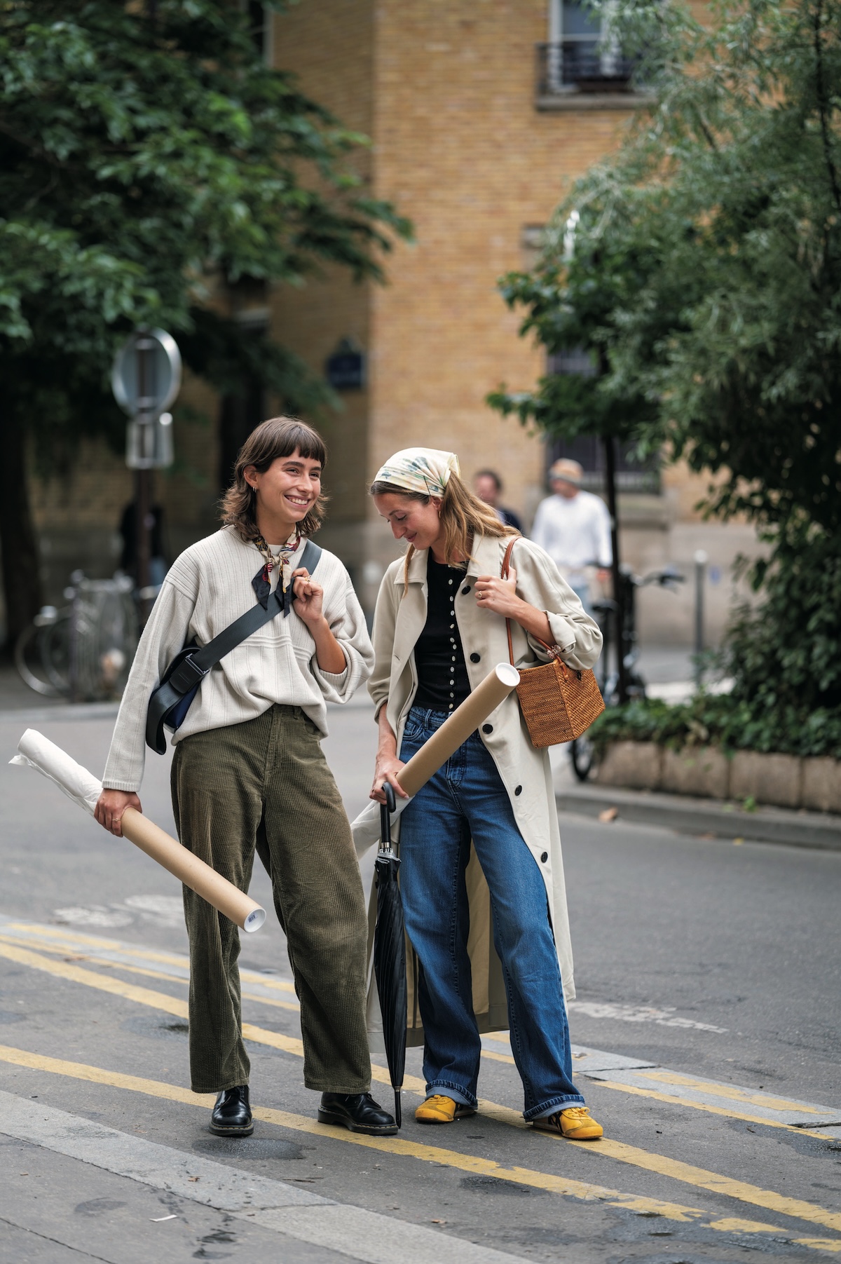 マレ地区にある人気書店〈Ofr.〉でポスターを購入したところ。2人はいとこ同士で昔から仲がよく、今はAgatheがパリに遊びに来ているんだって。首に巻いたり、ヘアアレンジに取り入れたり、スカーフ使いがいいね!