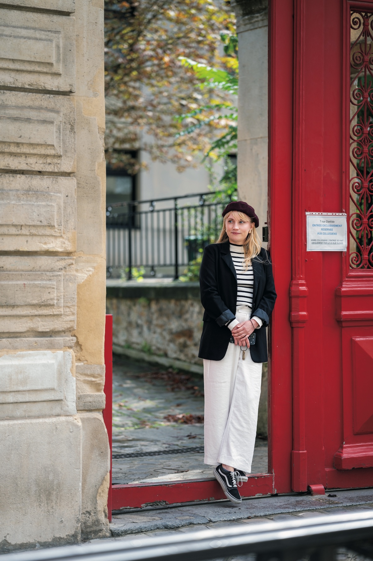 「おはよー! 」と元気な挨拶で子どもたちを迎えるAnnaは人気者。ベレー帽、ボーダーのセーター、ジャケット、ホワイトパンツを合わせた王道のフレンチスタイルを《ヴァンズ》のスニーカーでハズすテクニックがいい。