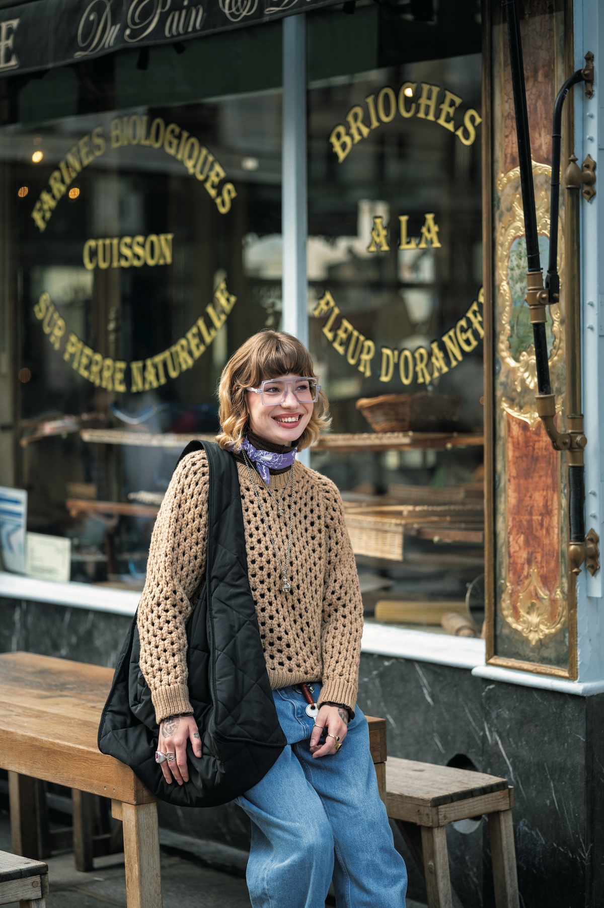 メガネやスカーフ、ネックレスなどで装いをキャッチーに仕立てるLucieは《EAT DUST》のスタッフ。お店のすぐ近くにある、有名&大人気ベーカリー〈デュ・パン・エ・デジデ〉は行きつけなのだとか。羨ましい。