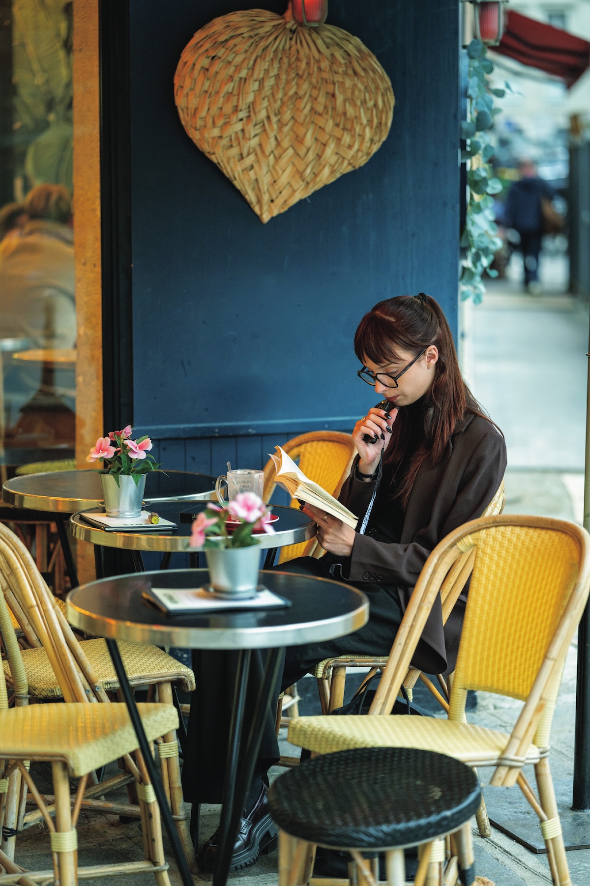 小雨が続くパリ。肌寒いからかカフェテラスの人はまばら。雨や寒さなんてお構いなしに読書に没頭する彼女は、ジャストサイズなコーディネートと姿勢のいい居住まいによって気品が漂っている。ジャケットとローファーの色がリンクしてるのも好ポイント。