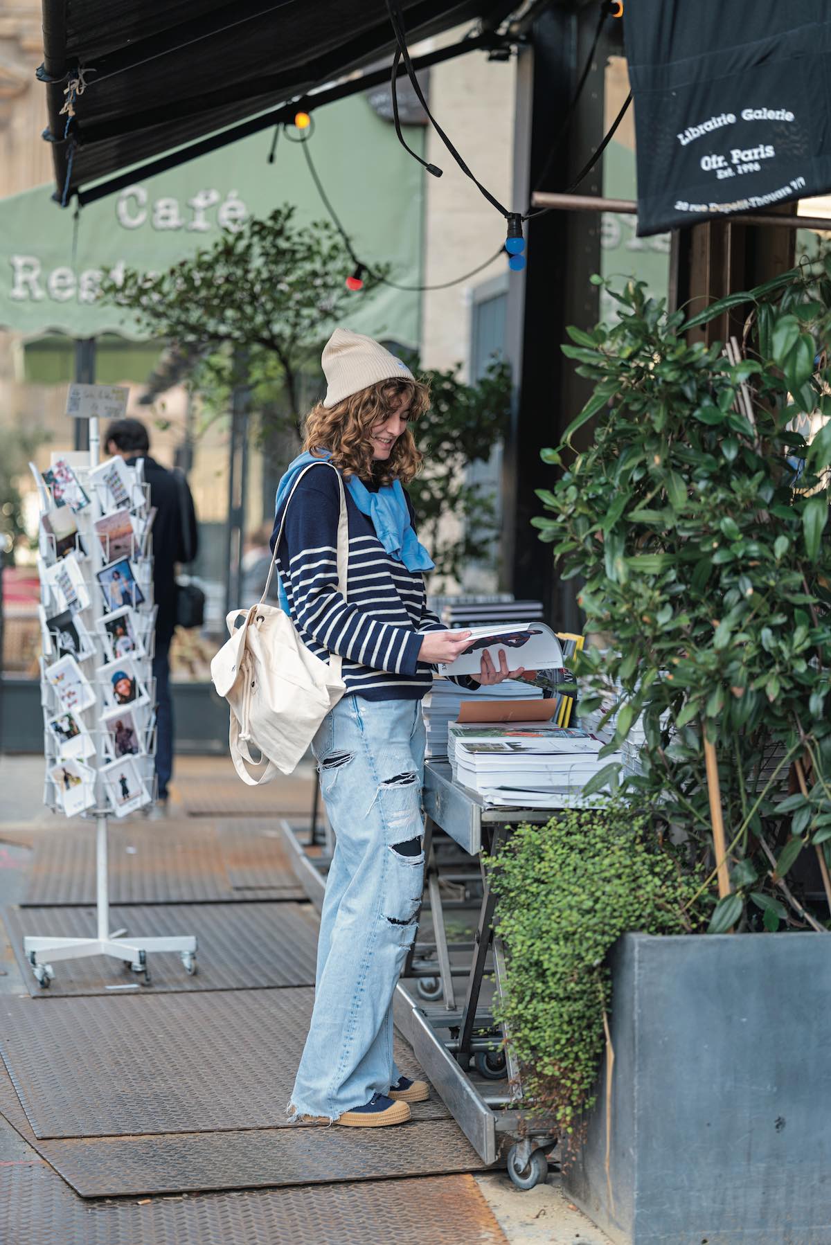 クリエイターにも信頼されるアートブックショップ《Ofr. Paris》。彼女はその常連さんで、ここへ来るたびにオーナーとおしゃべりしたり、新しい本を探したり……。ブルーとホワイトで爽やかに仕上げた冬スタイルが好印象。