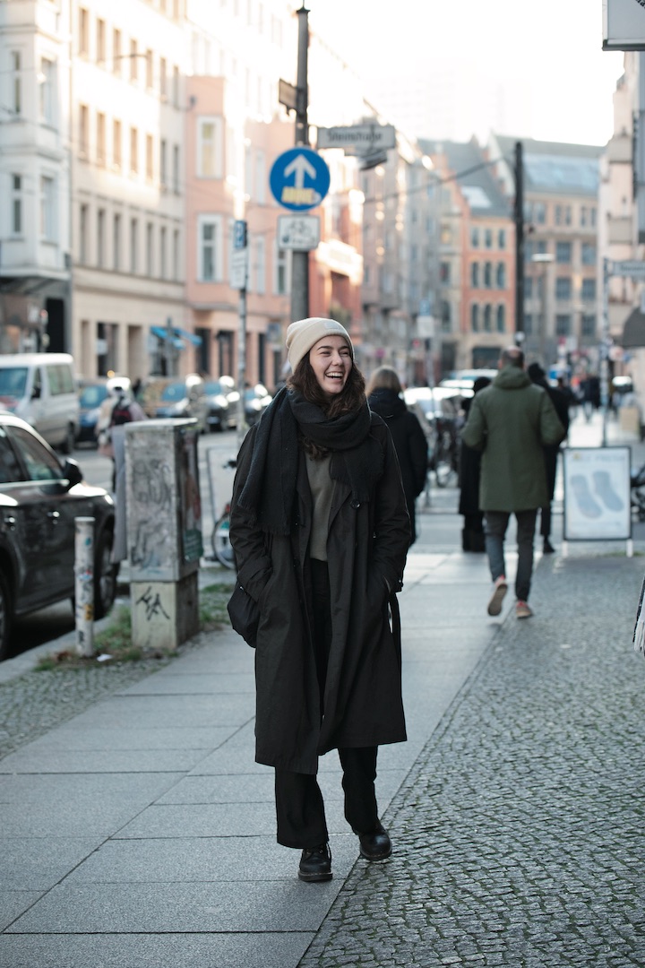 コート、セーター/ Vintage 、 パンツ / Monki、シューズ/ Dr.Martens、トートバッ グ / unknown、 ニットキャップ / Urban Outfitters、マフラー/ H&M