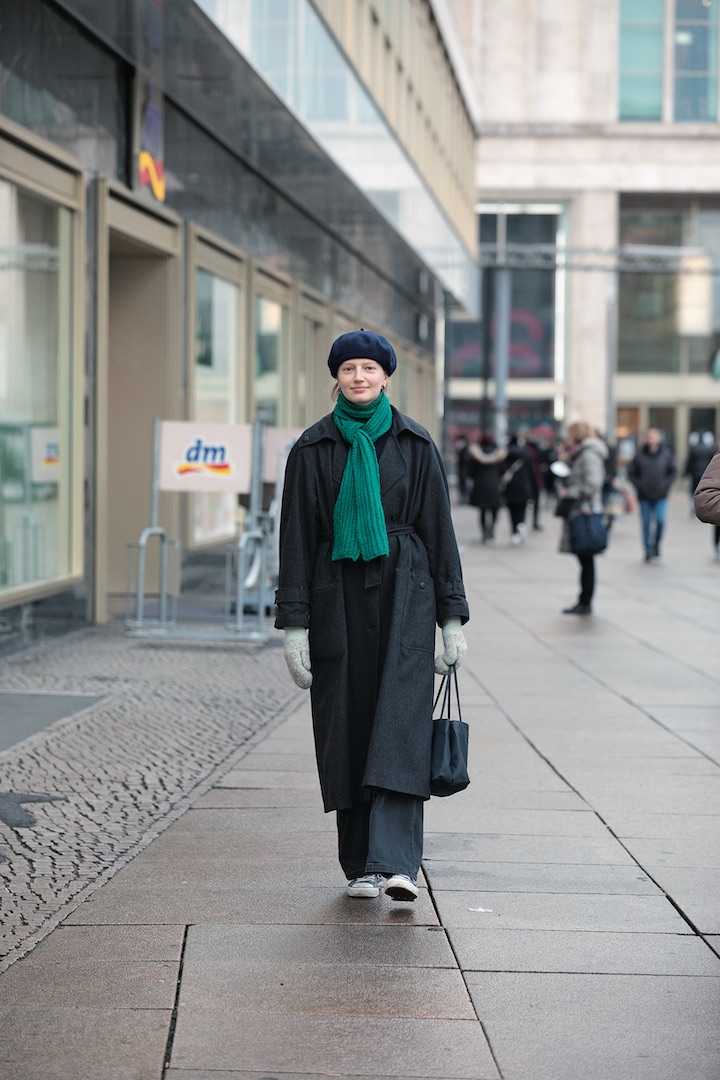 ウール素材のロングコートにブラックデニムを合わせたミニマルな装い。そこに加えた鮮やかなグリーンの手編みマフラーがいいアクセントに。足元の《コンバース》による軽さもグッド!
