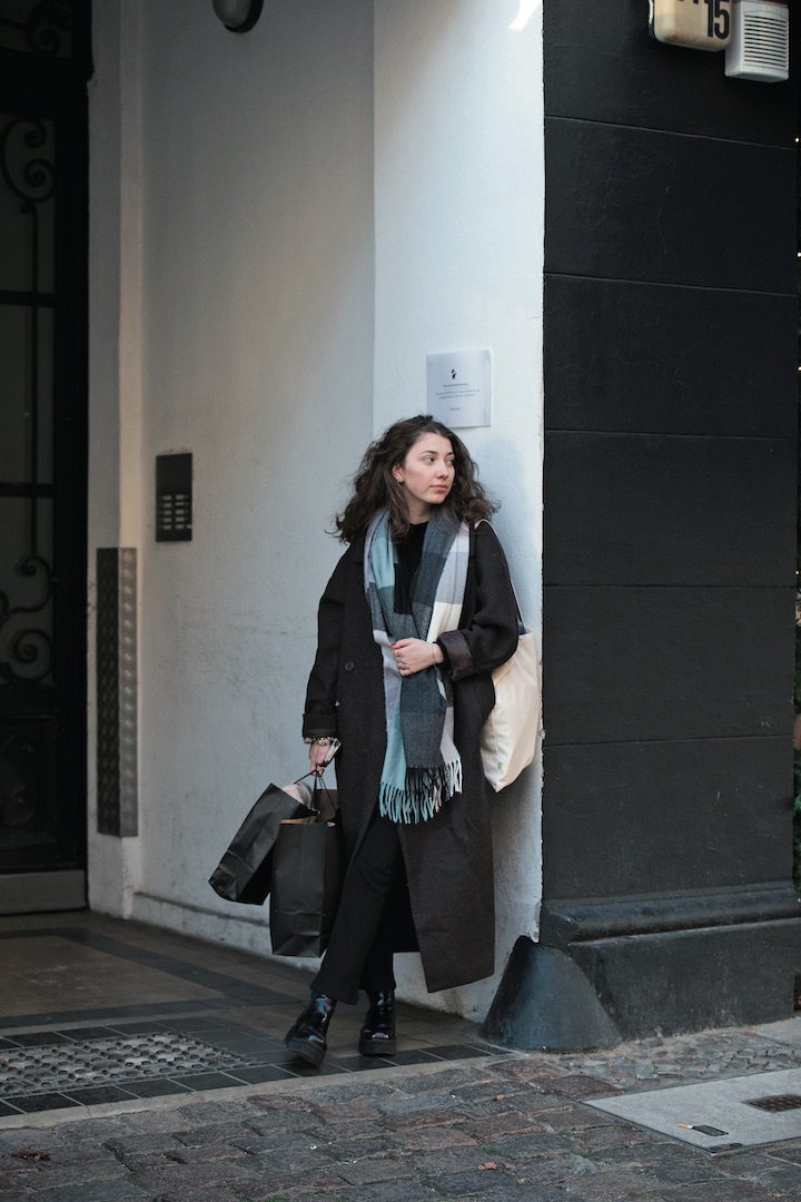 コート/ WEEKDAY、セーター、パンツ/ともに Urban Outfitters、ブーツ/ Vagabond、トートバッ グ/ Zalando、マフラー/ Vintage