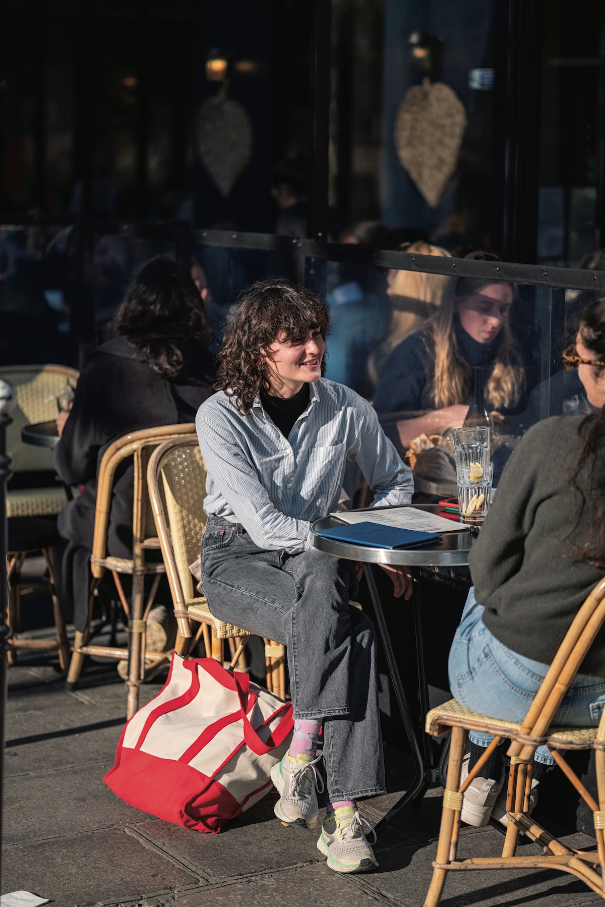 パリの風景に映える装いは、きっと職業柄。映画プロダクションに勤務するレア、タートルネックとシャツの重ね技や赤の差し色など、スタイリングに小技がきらり。「私は裏方だから! 」と笑いながらも、一際オーラを放っている。