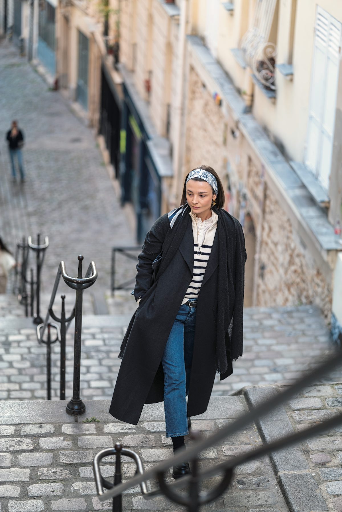 パリで最も高い場所に位置し、古きよきパリの風情を感じさせるモンマルトルの丘。映画「アメリ」の主人公が暮らすトロワ・フレール通りへ続く階段で一際目を引く彼女は、生粋のフレンチレディ。グルノーブルというアルプスが望める街に住んでいて、パリも好きだけれどやっぱり美しい故郷を離れられないのだそう。ボーダー柄に、フリルブラウス、サブリナ丈のパンツ、スカーフ使いなど……その着こなしにはフレンチスタイルのキーワードが詰まっている。