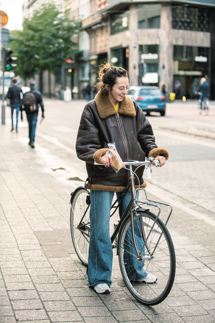 自転車を推奨しているベルギーでは、サイクリストが多数。彼女もその一人で、どこへ行くにもこの愛車と一緒。親友のおじいちゃんから譲り受けたこのジャケットがあれば、寒い日の自転車もへっちゃらなのだそう。