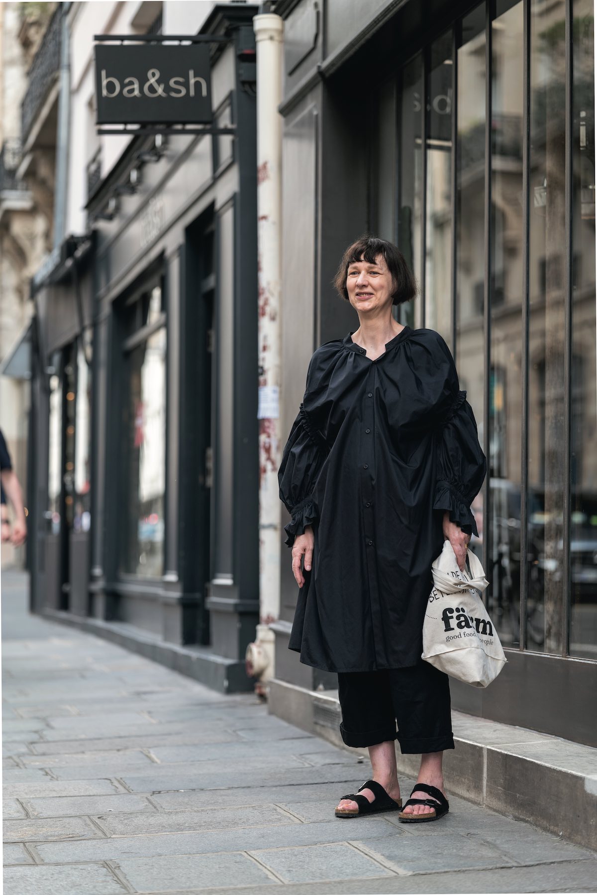 ブラウス/Kei Ninomiya (Commedes Garçon Noir)、パンツ/Vintage、サンダル/BIRKENSTOCK