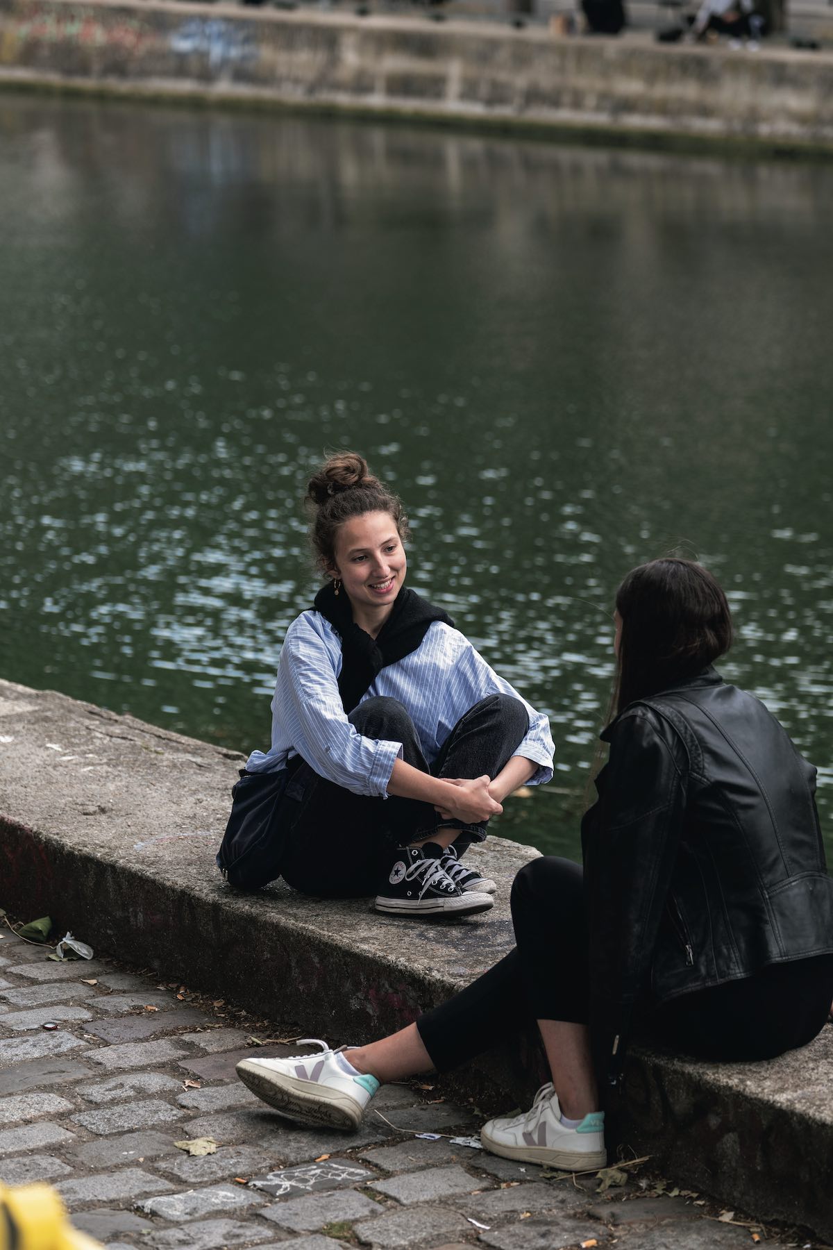 夜8時を過ぎても明るい夏のパリ。サン・マルタン運河には、川辺に沿ってお喋りやお酒を楽しむ人で溢れている。彼女もその1人。ダークトーンでまとめた装いに、水色のシャツが爽やかな風を吹き込む。