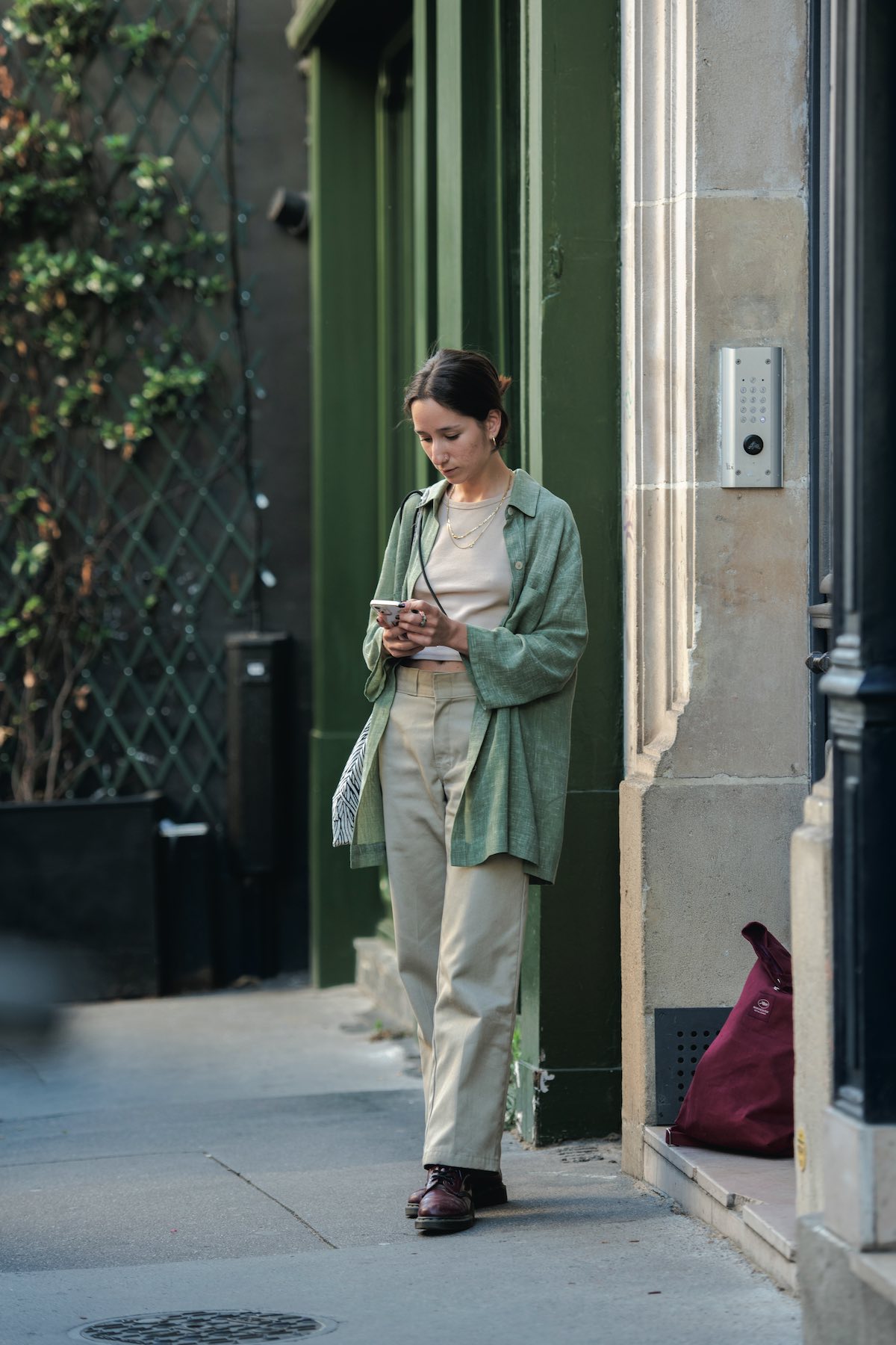 ベージュやミントグリーンなど、淡い色味で整えた装いは、Victoriaの優しい人柄を表しているかのよう。赤いブーツとバックパックによるカラーアクセントや、アクセサリー使いもいい。