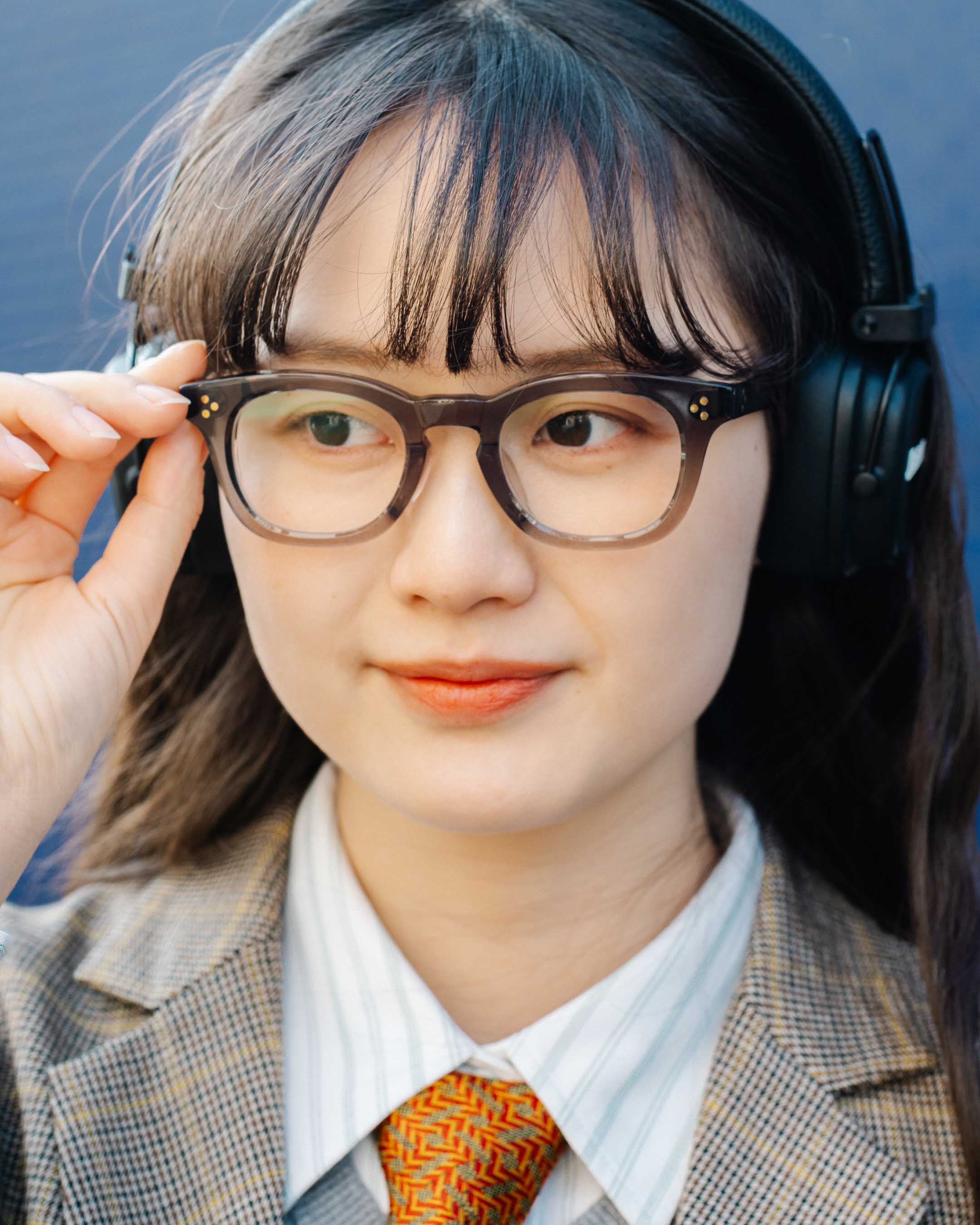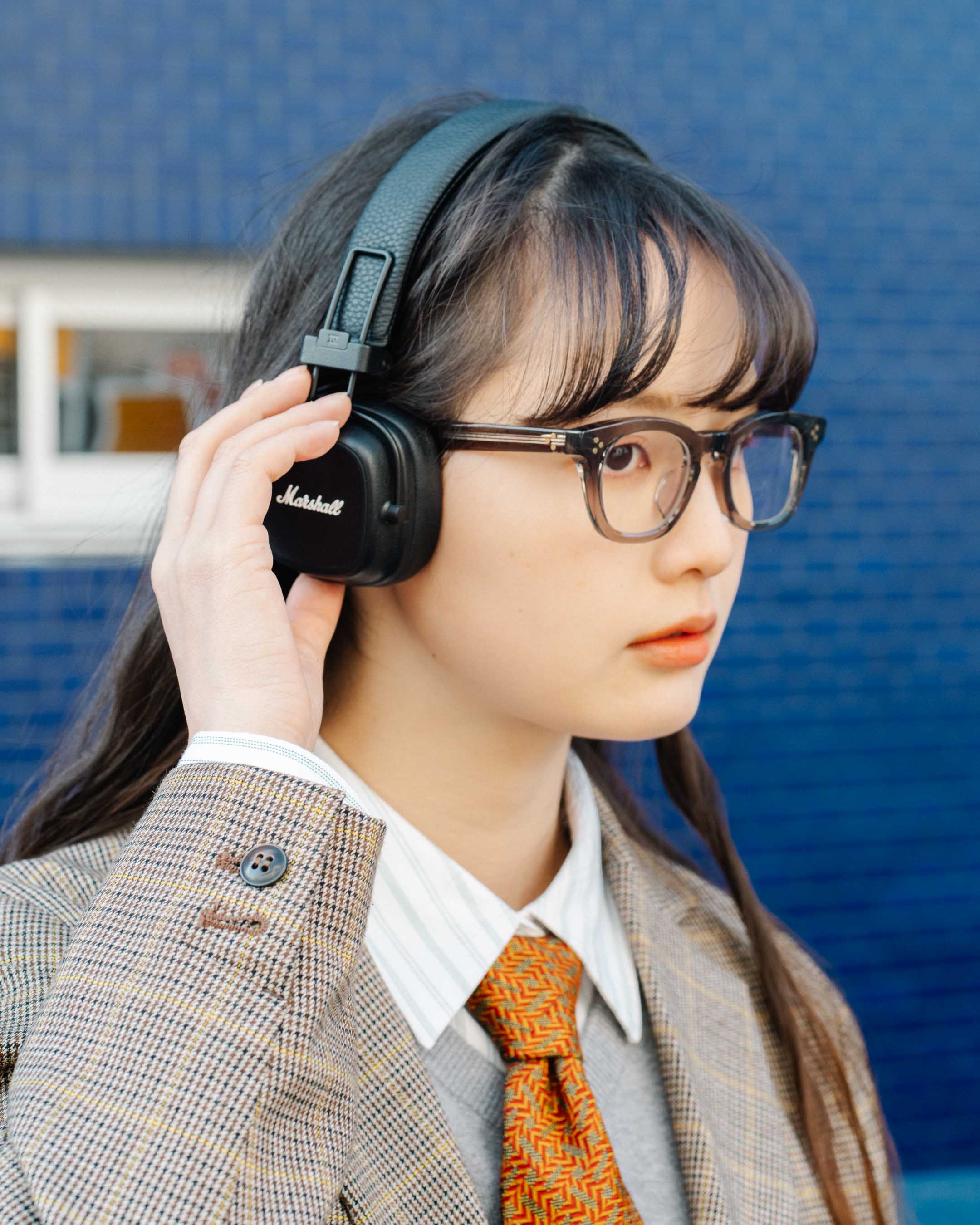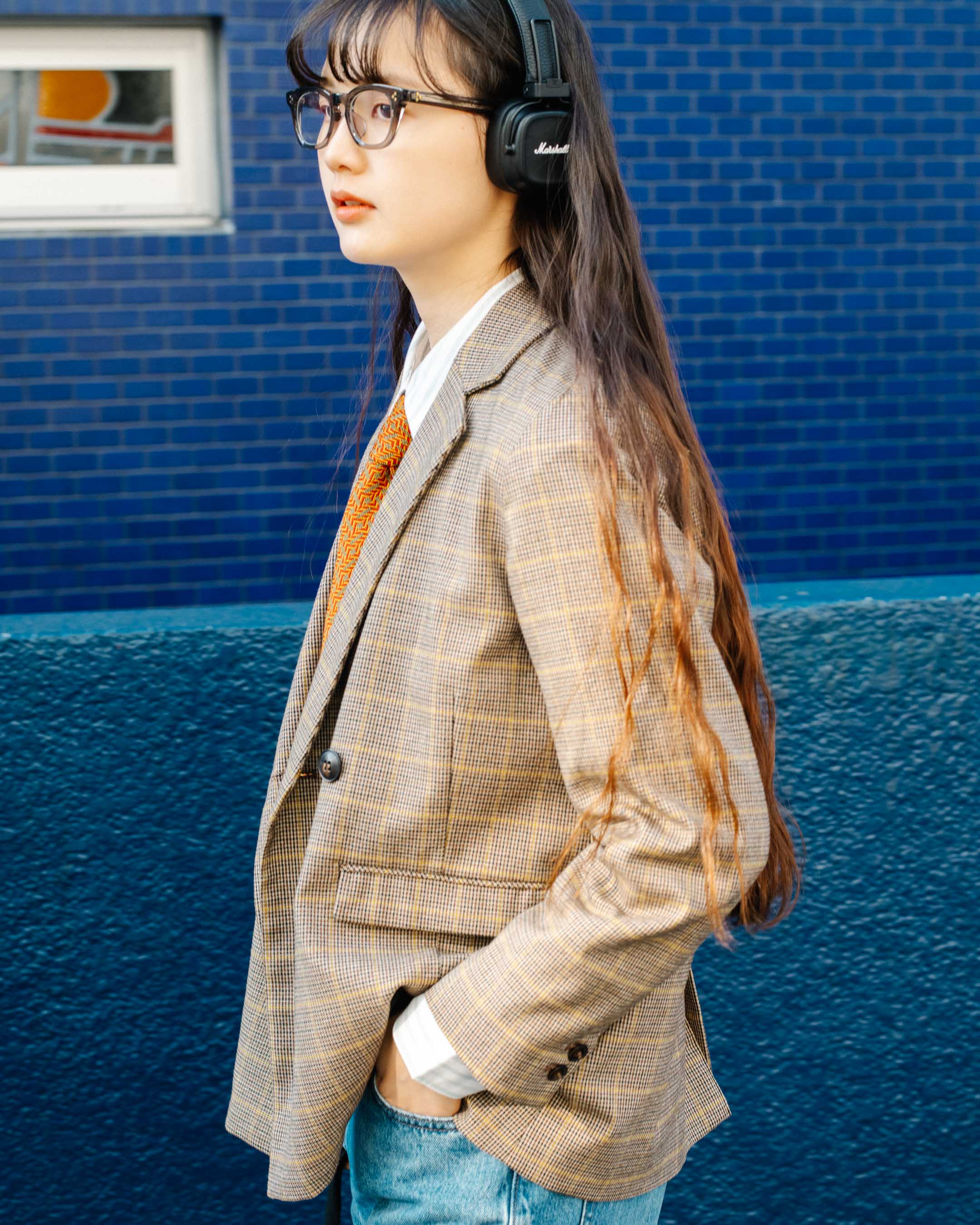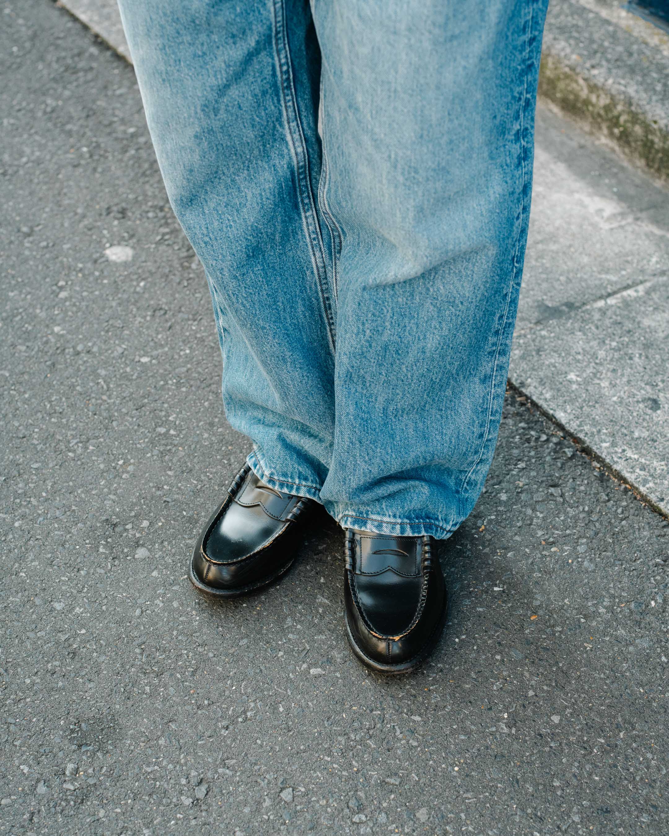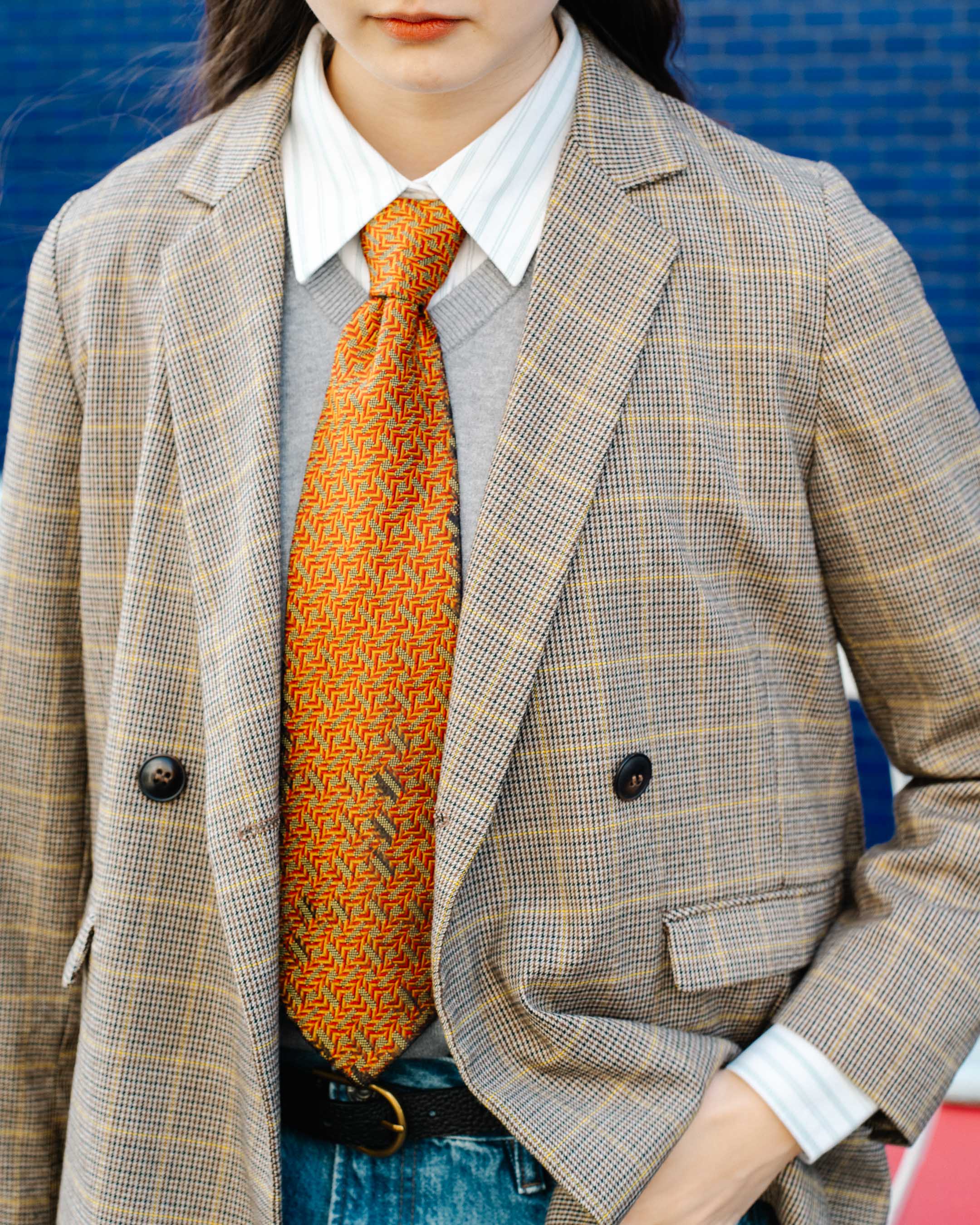 かっちりとしたアウターに古着を合わせたゆるっとトラッドコーデ。