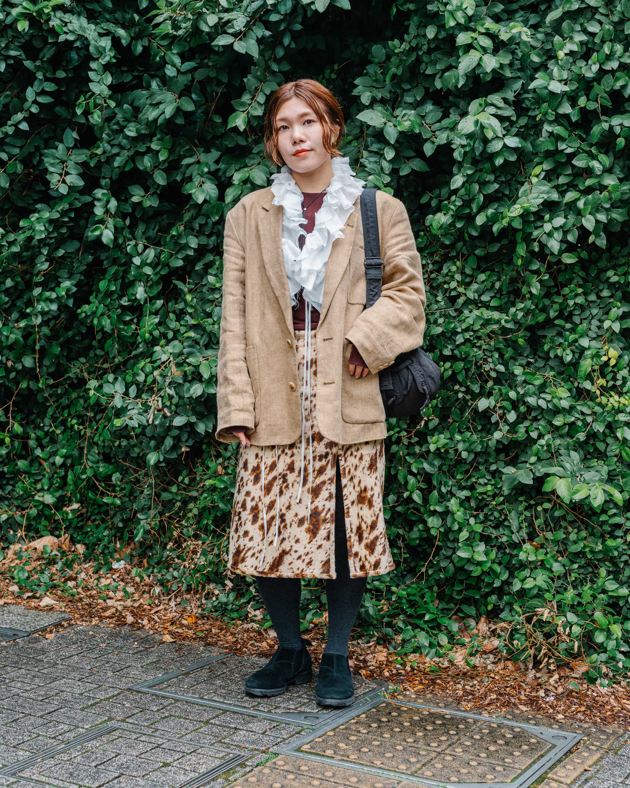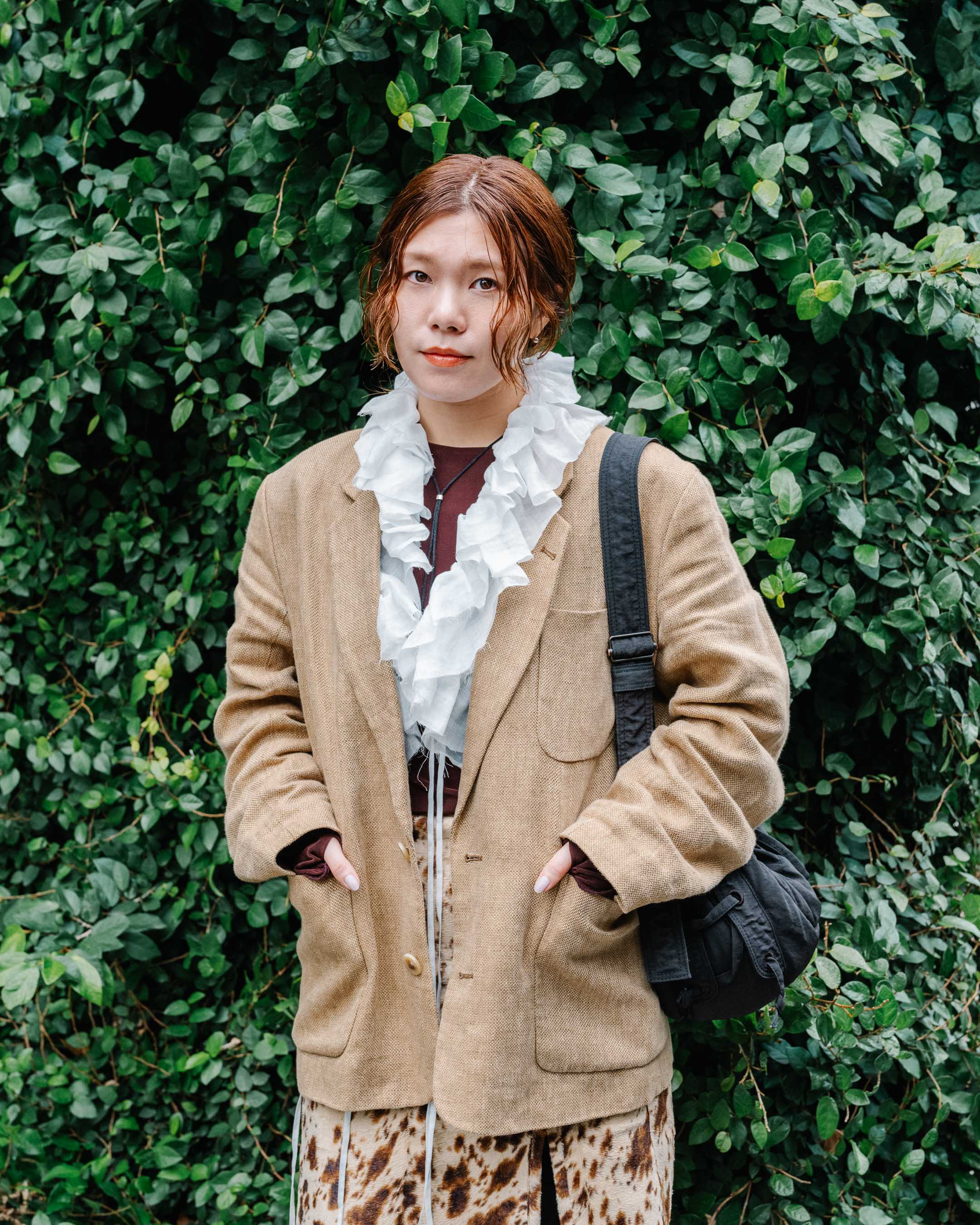 リネンジャケットをメインに、シフォンベストをインして胸元にポイントを。素材感で春らしさを出して。