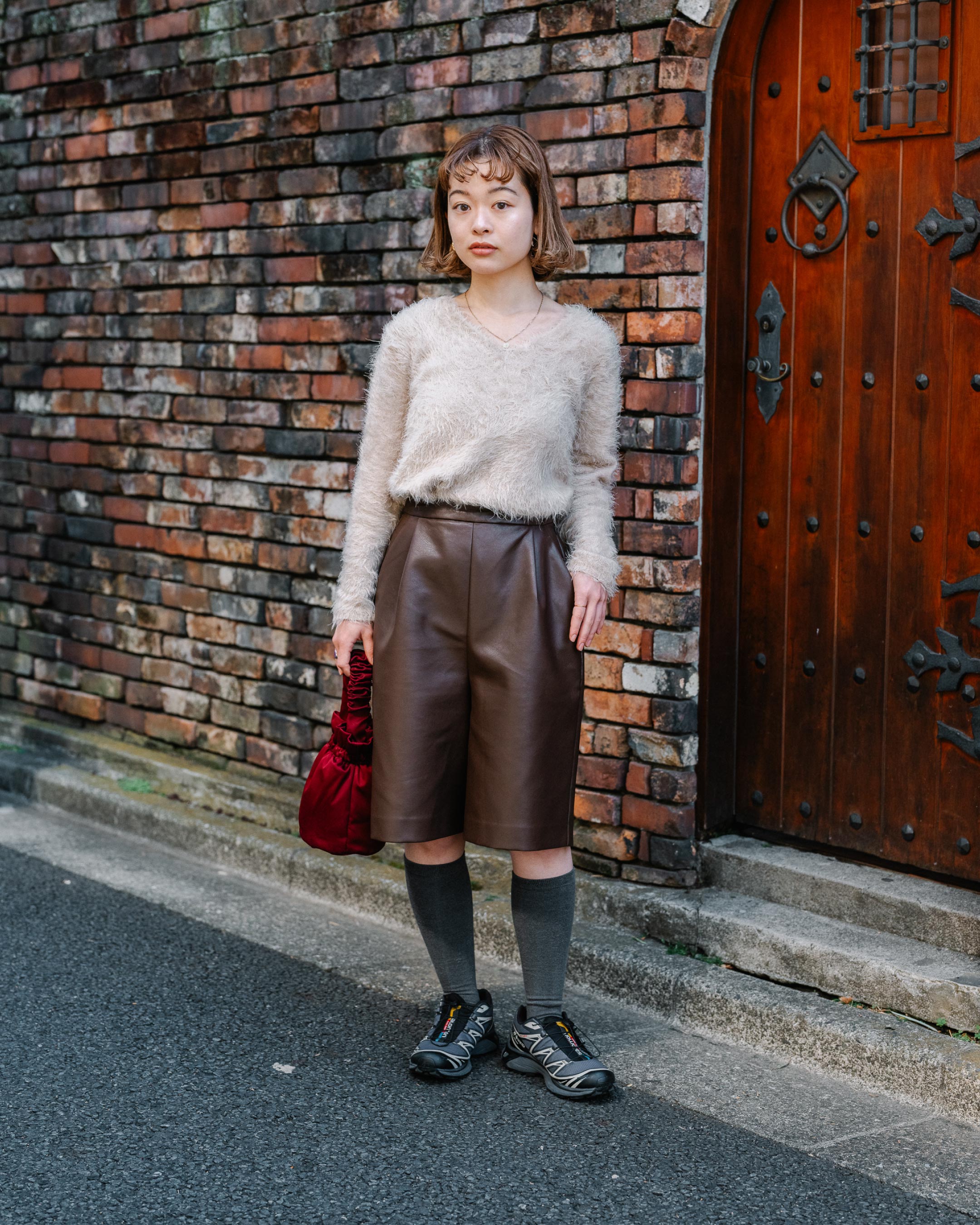 Vネックのトップスで抜け感を、ガーリーになりすぎないようにハーフパンツでバランスを。