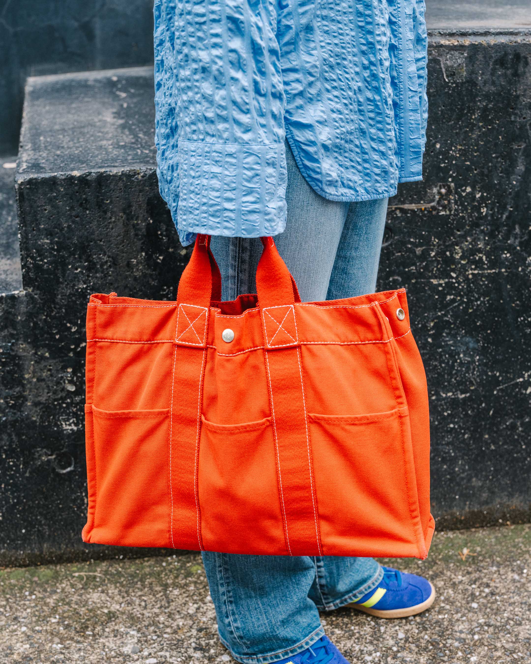 爽やかにブルーでまとめたコーデの中に赤いバッグが映える!