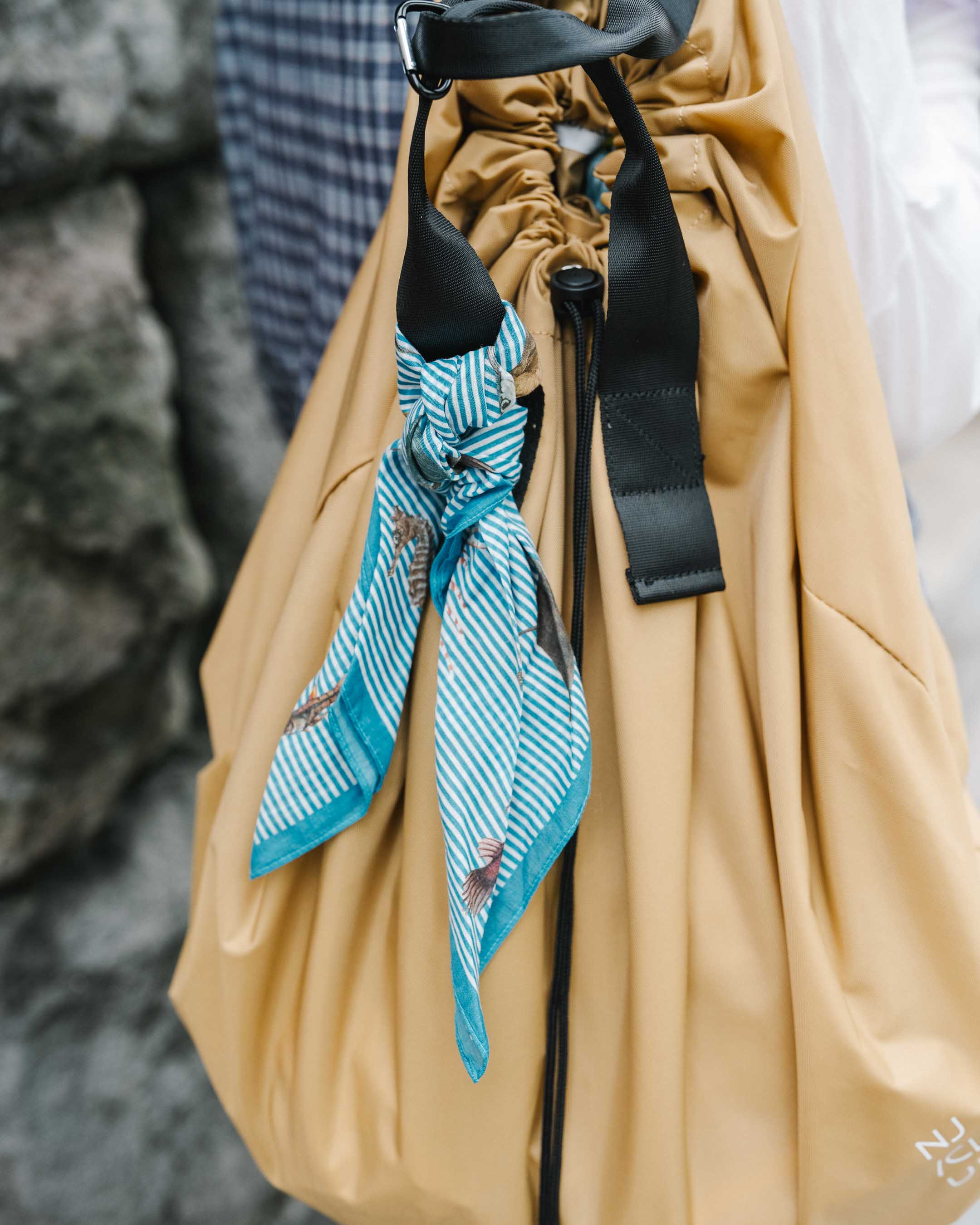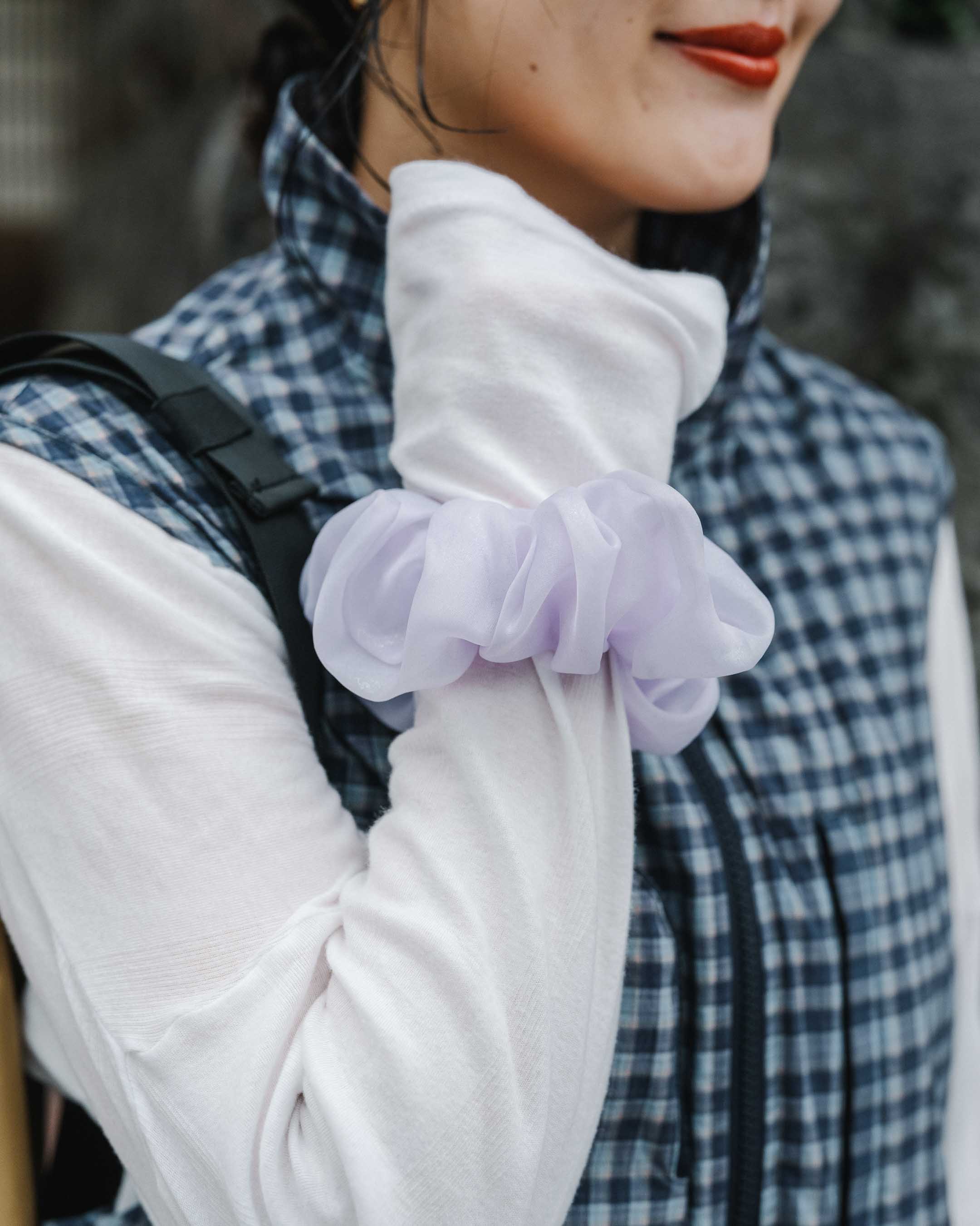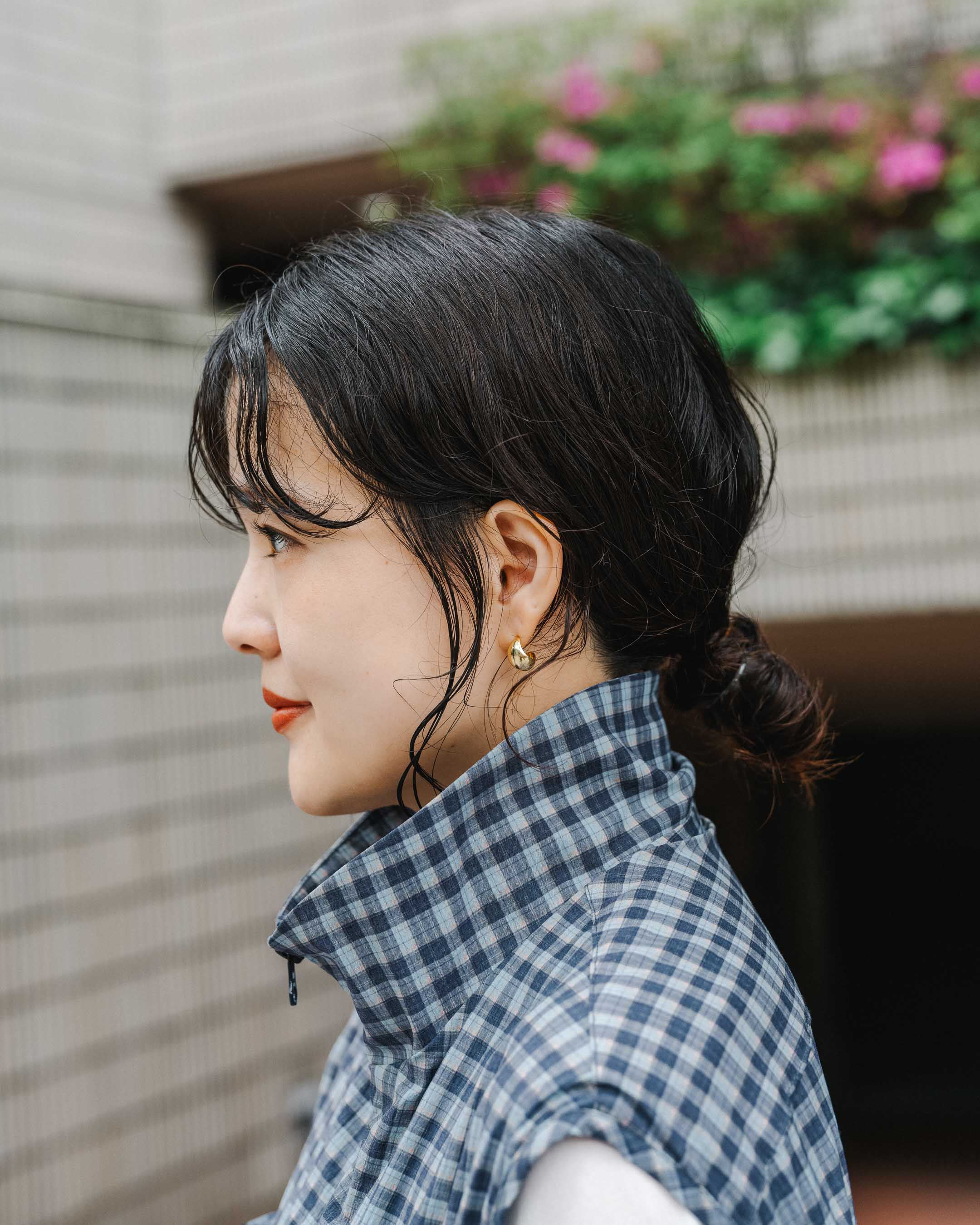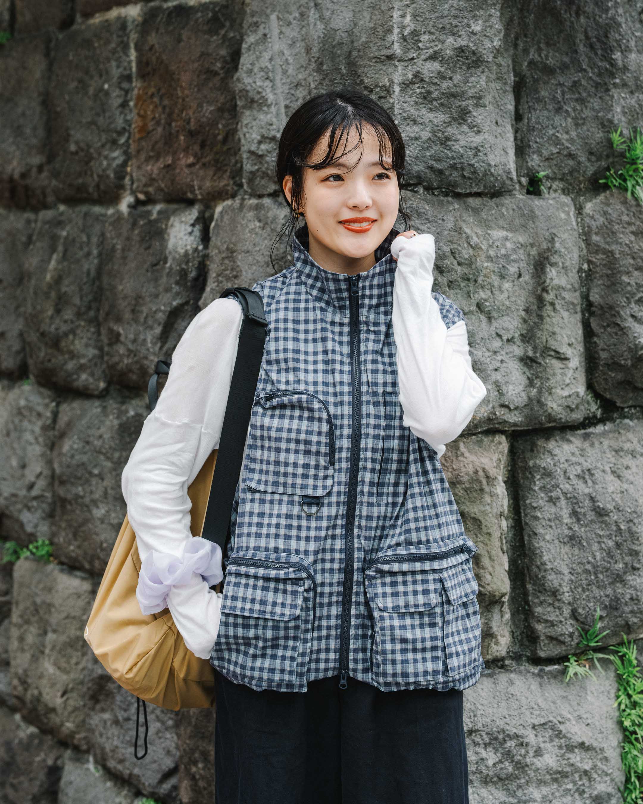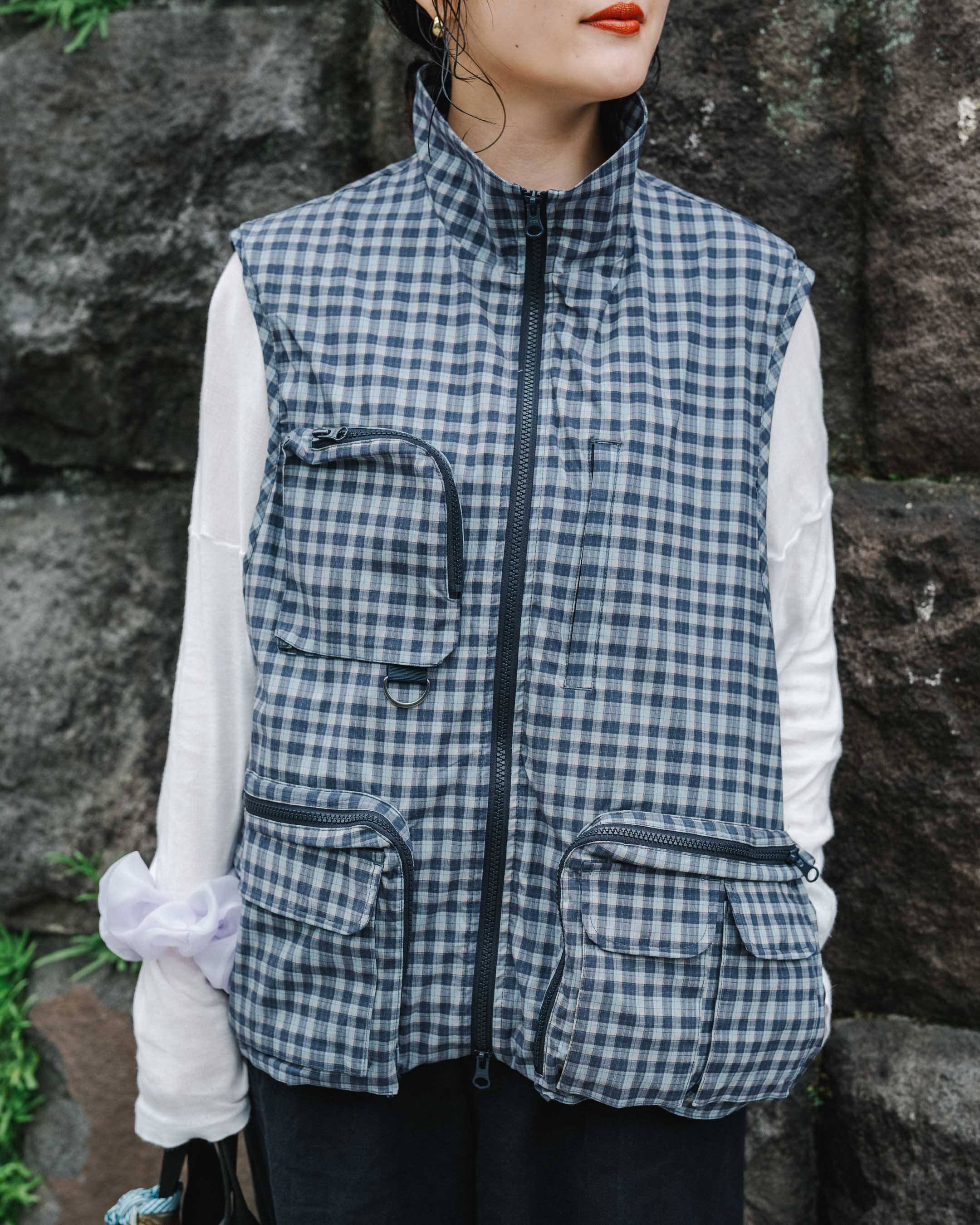 シアーのコットントップスとベストで初夏のレイヤードスタイルを意識して。ブルーやネイビートーンでまとめる。