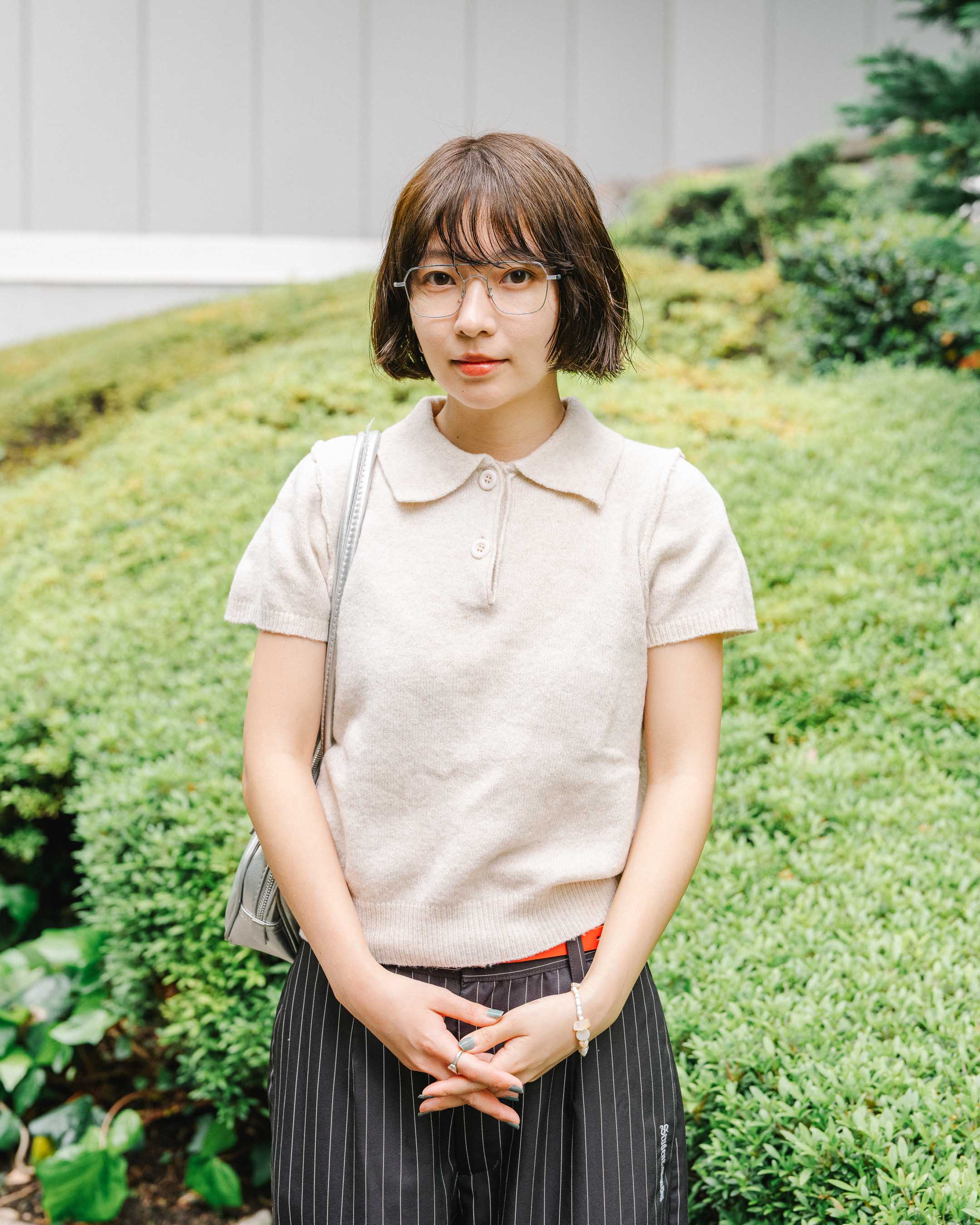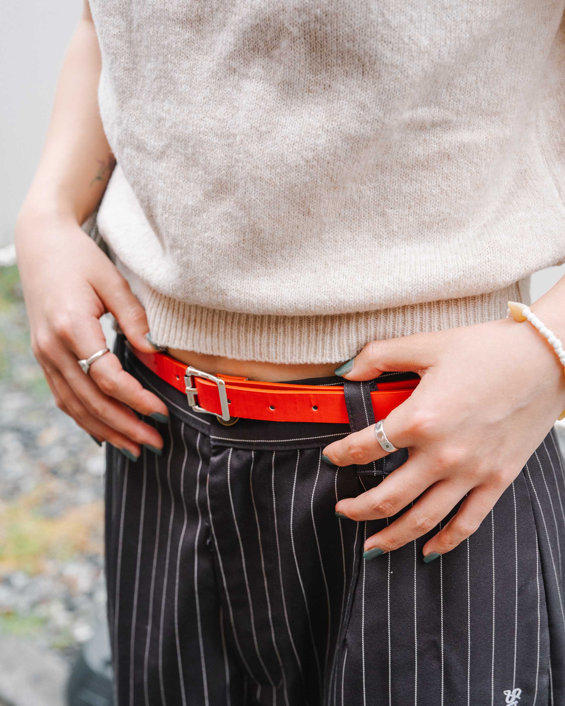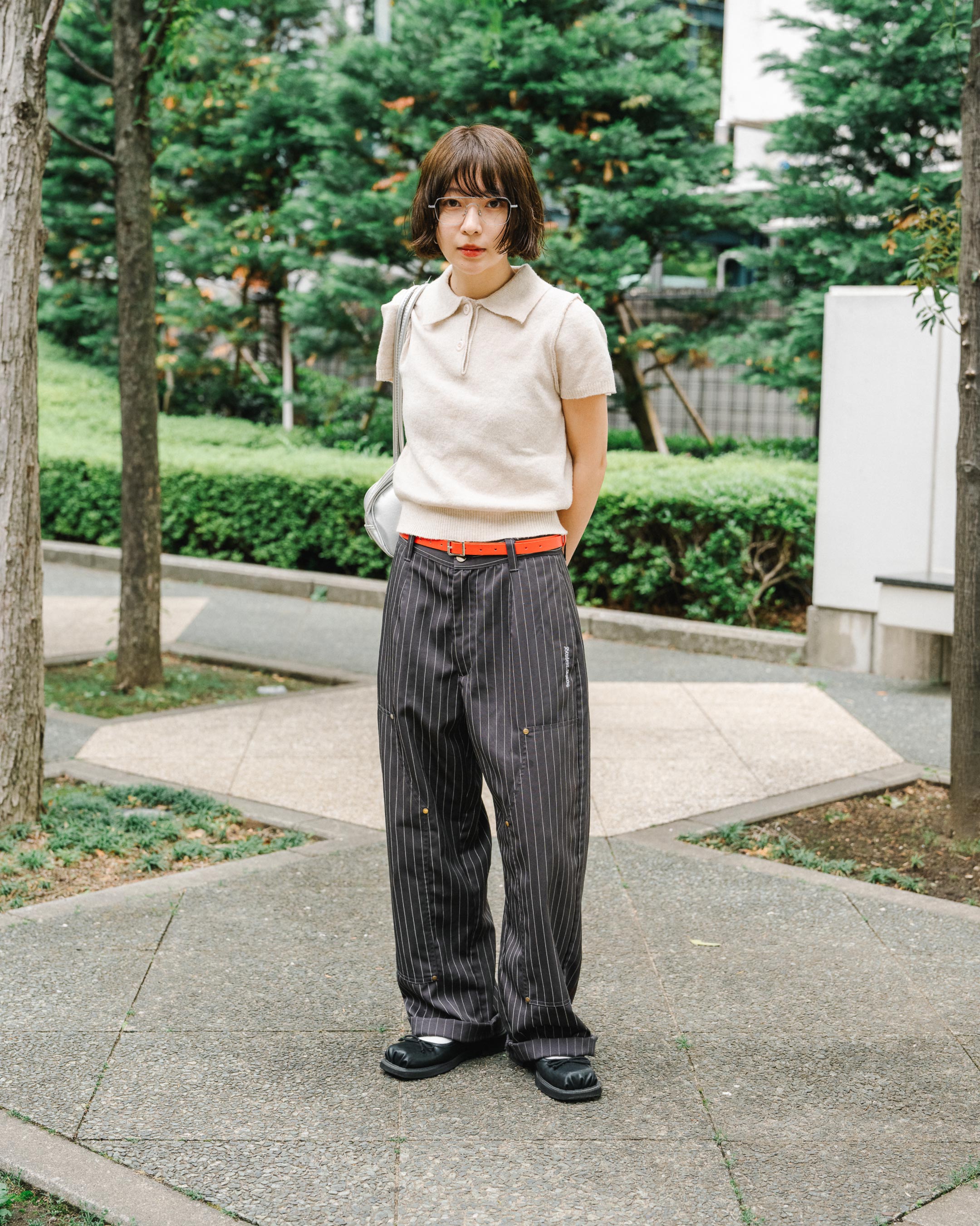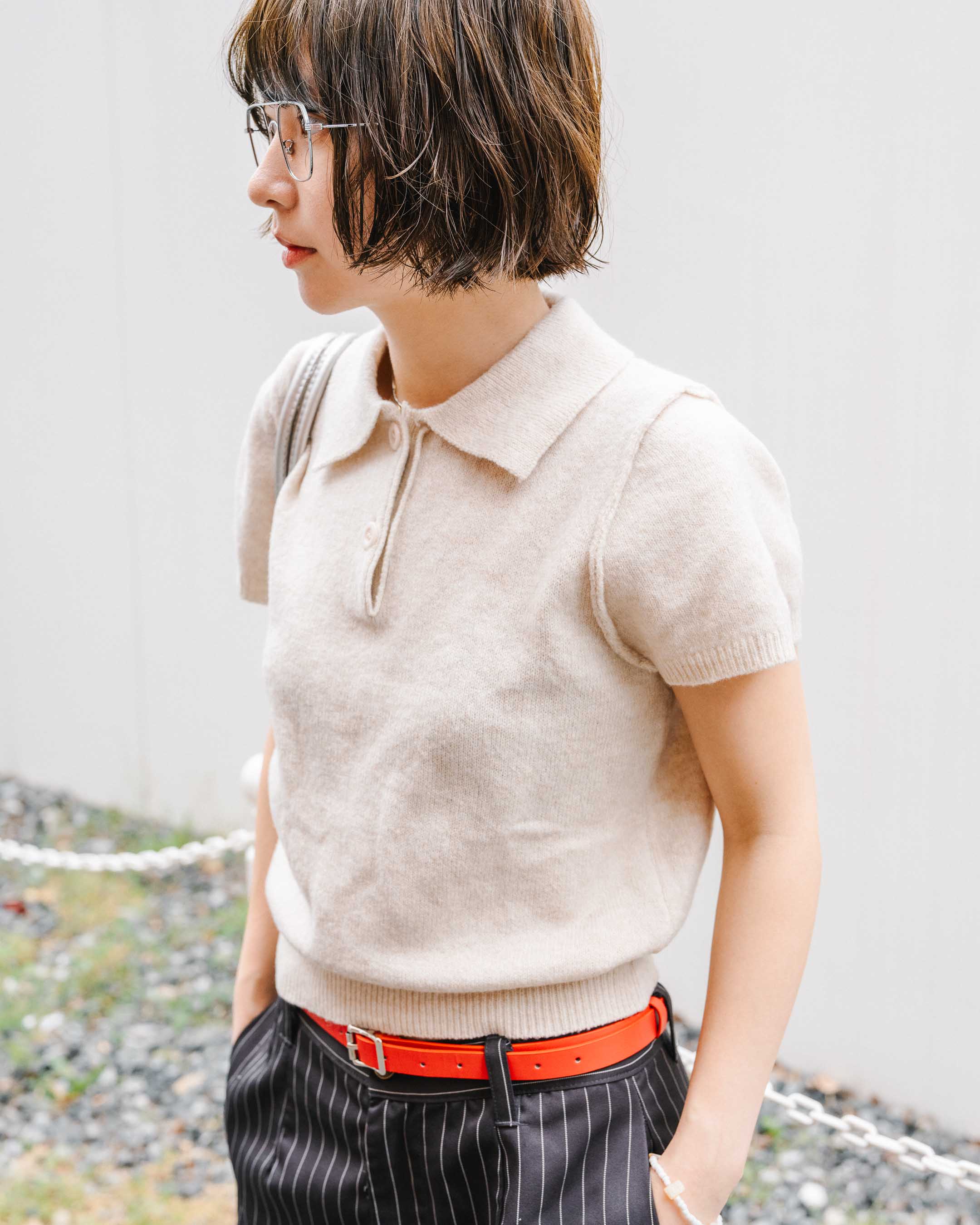 爽やかポロコーデは、赤のベルトで差し色をON!