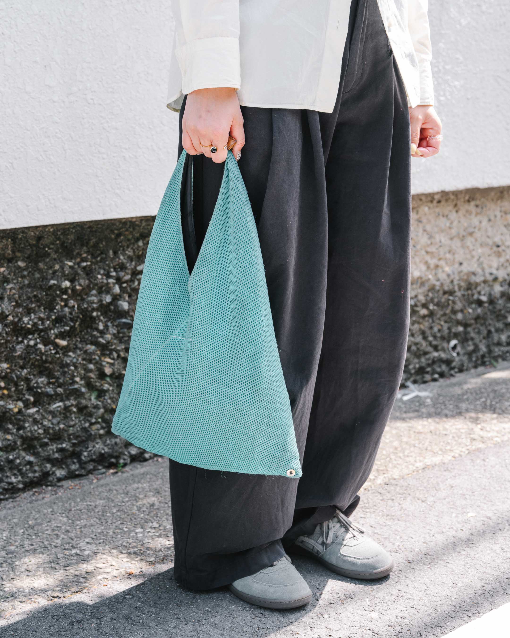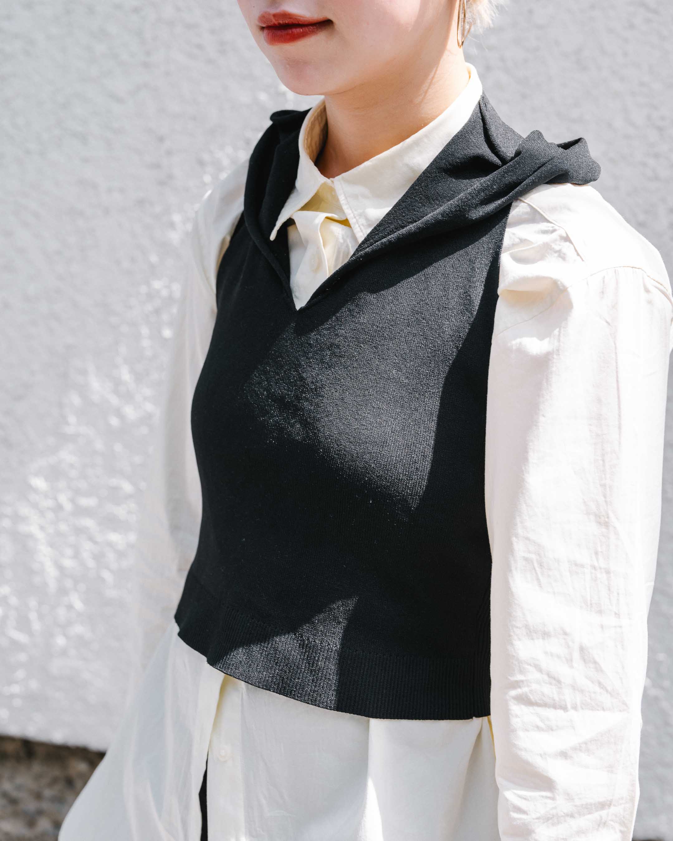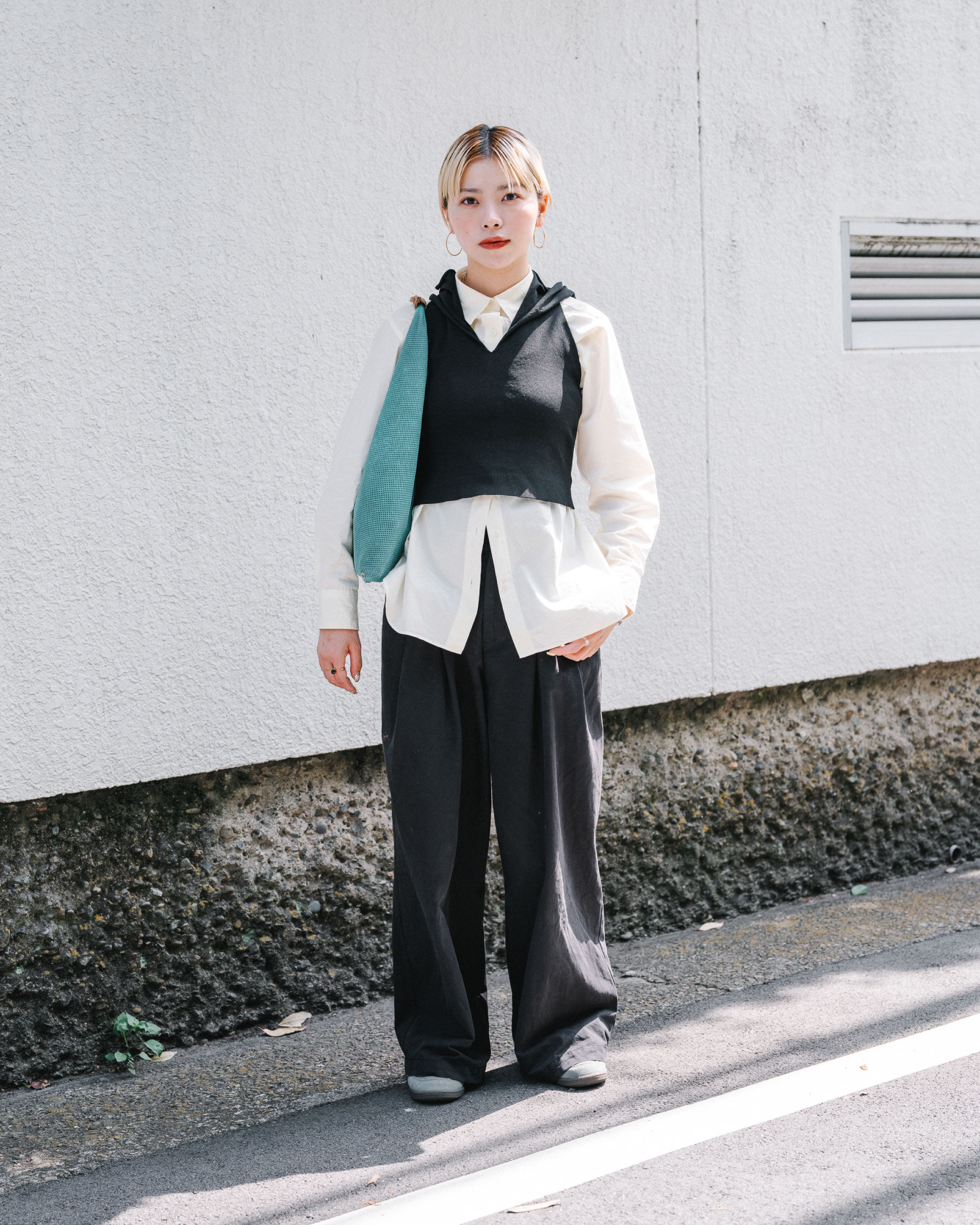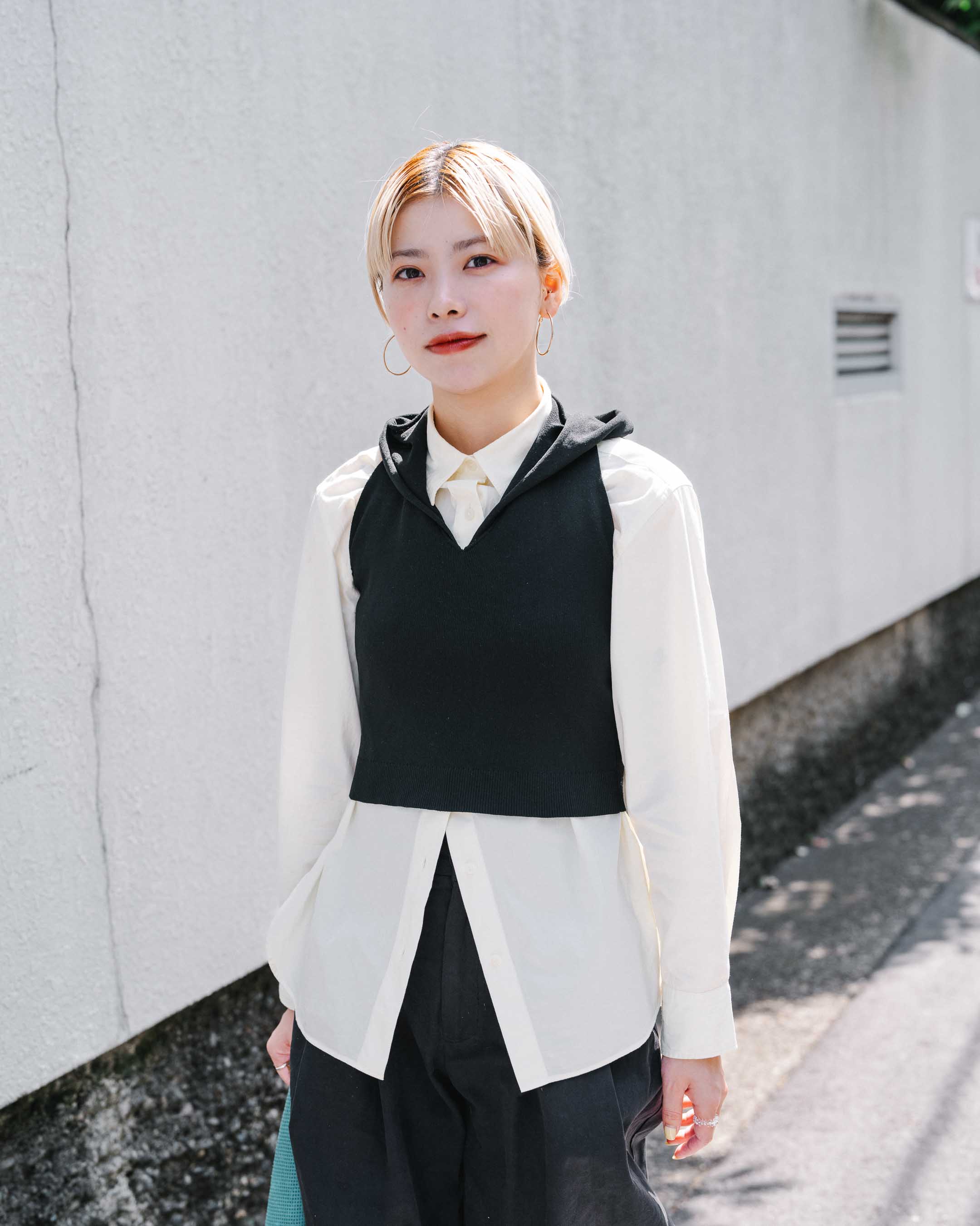 コンパクトなサイズ感のベストを主役に、ボトムスを大きめにしてバランスをとる。