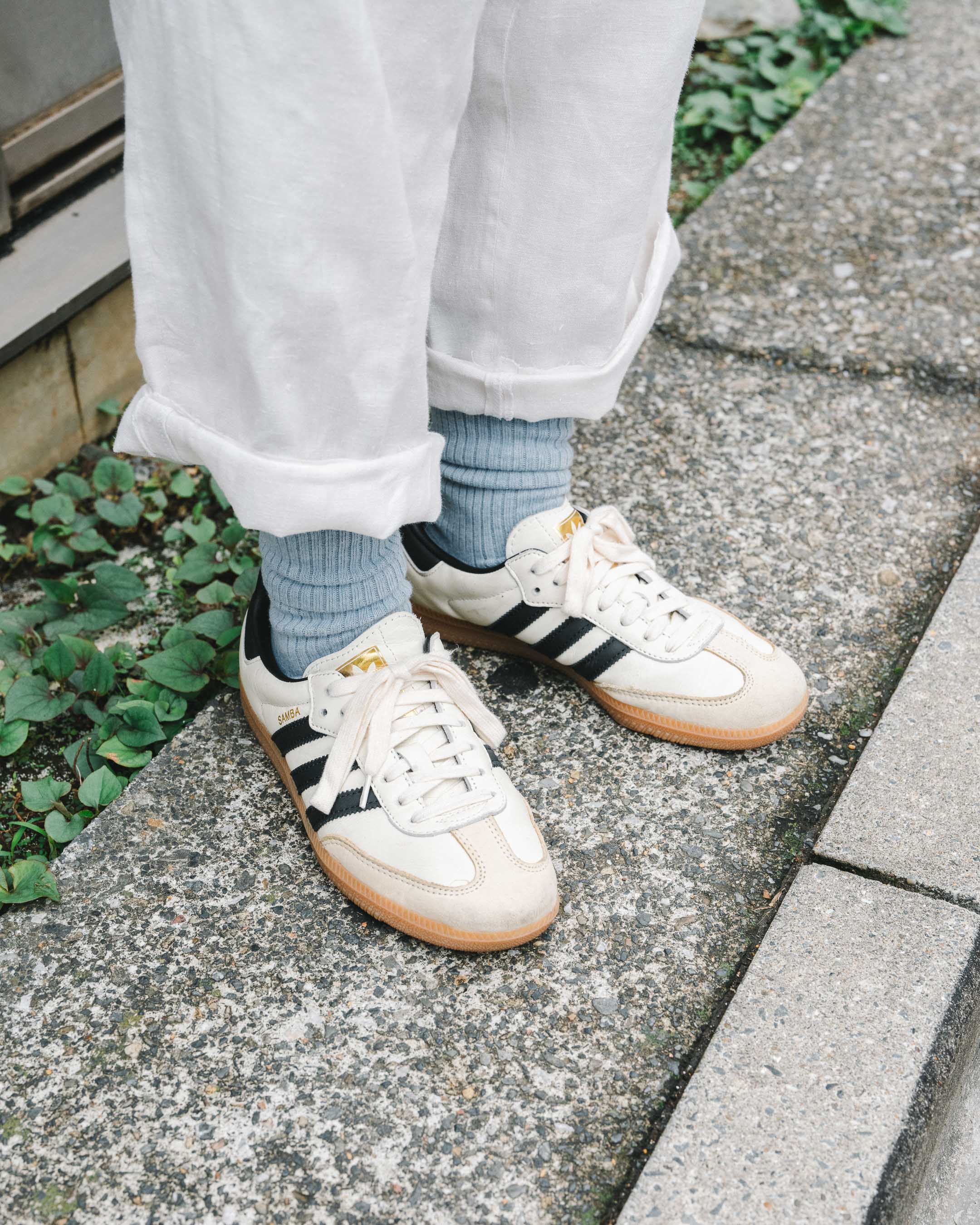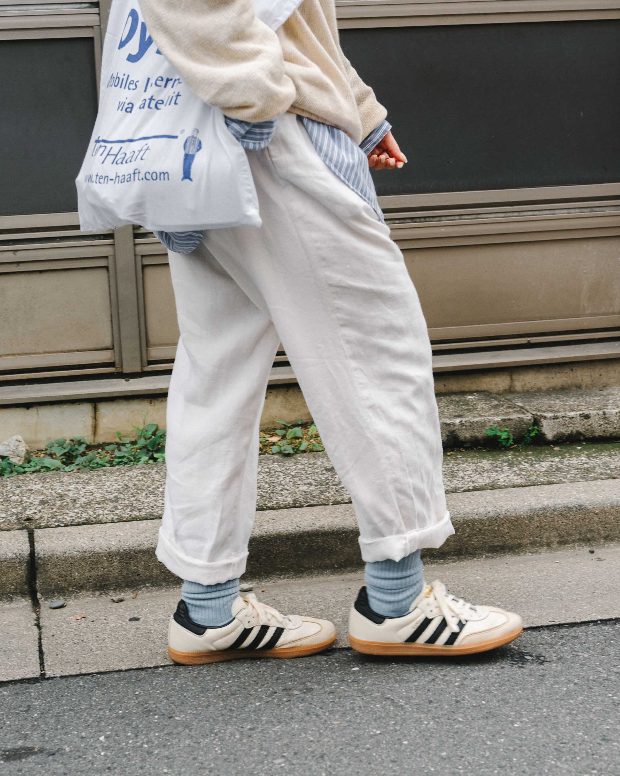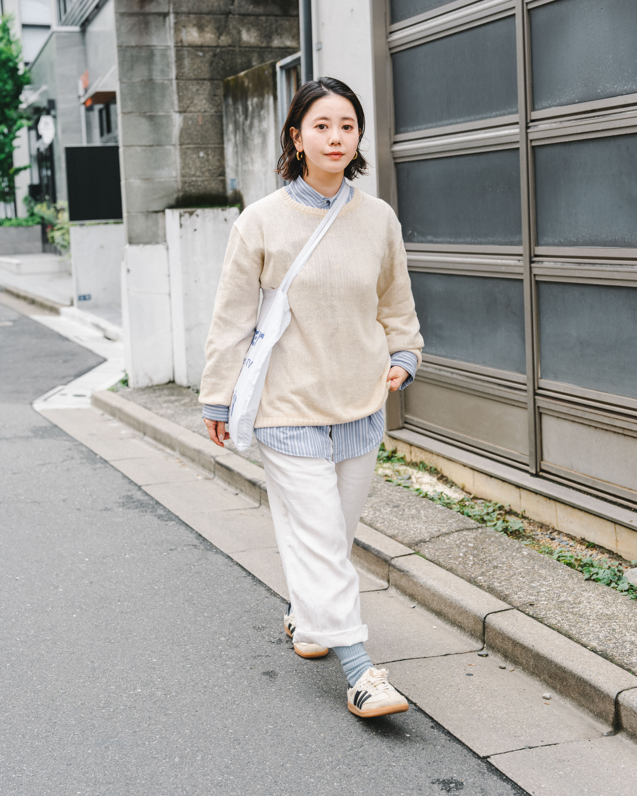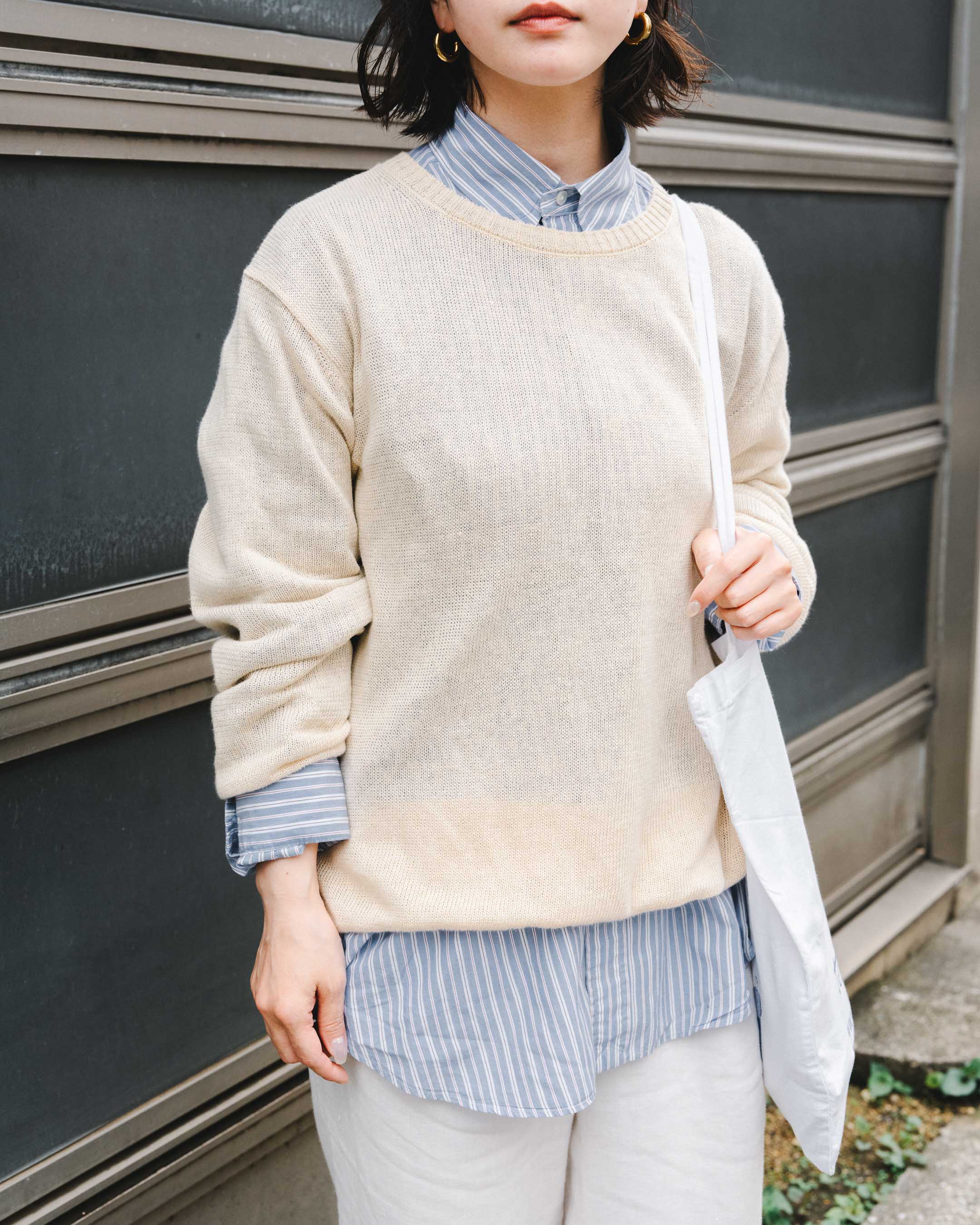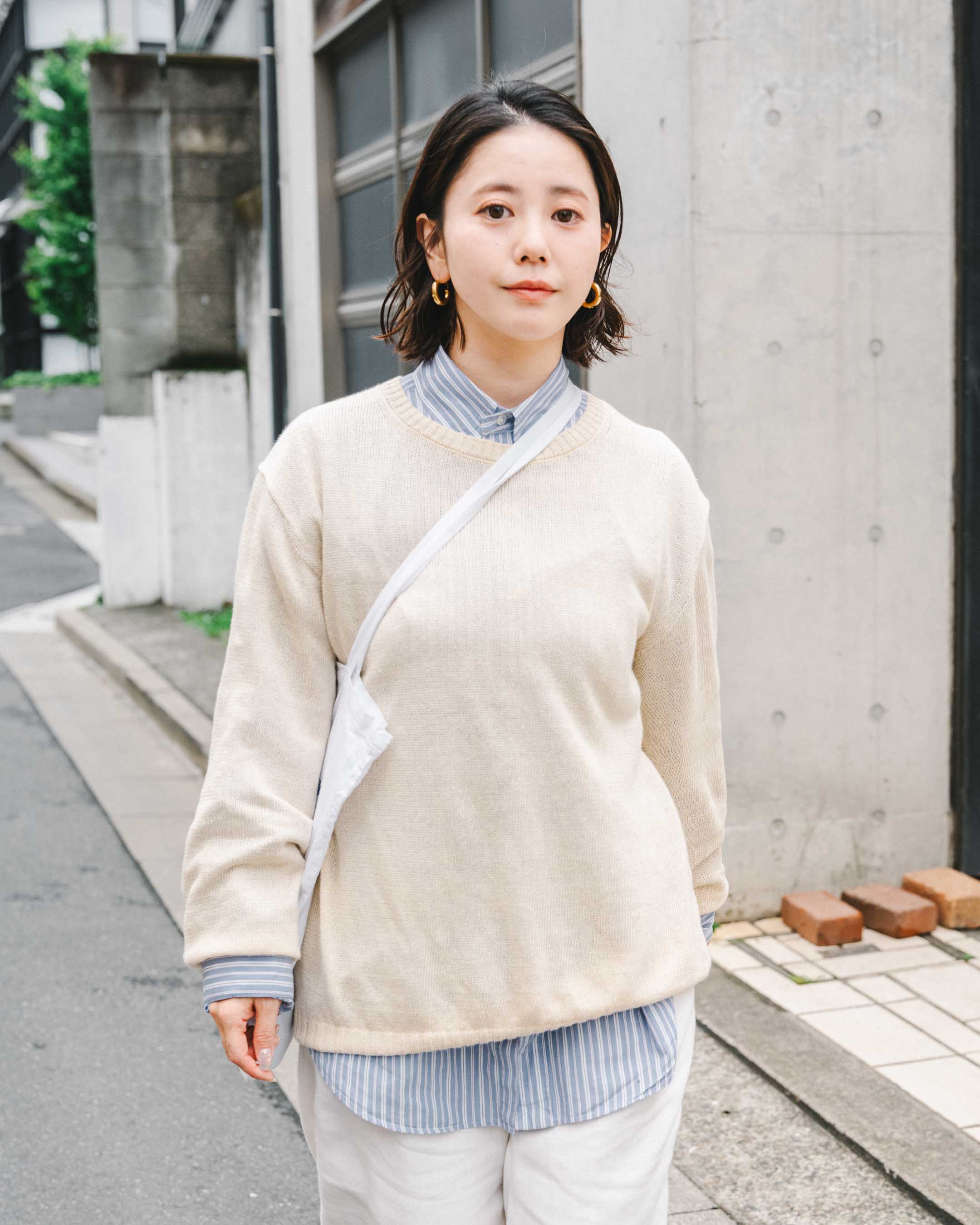 ホワイト×ブルールック!サマーニットやリネンパンツで季節感も意識して。