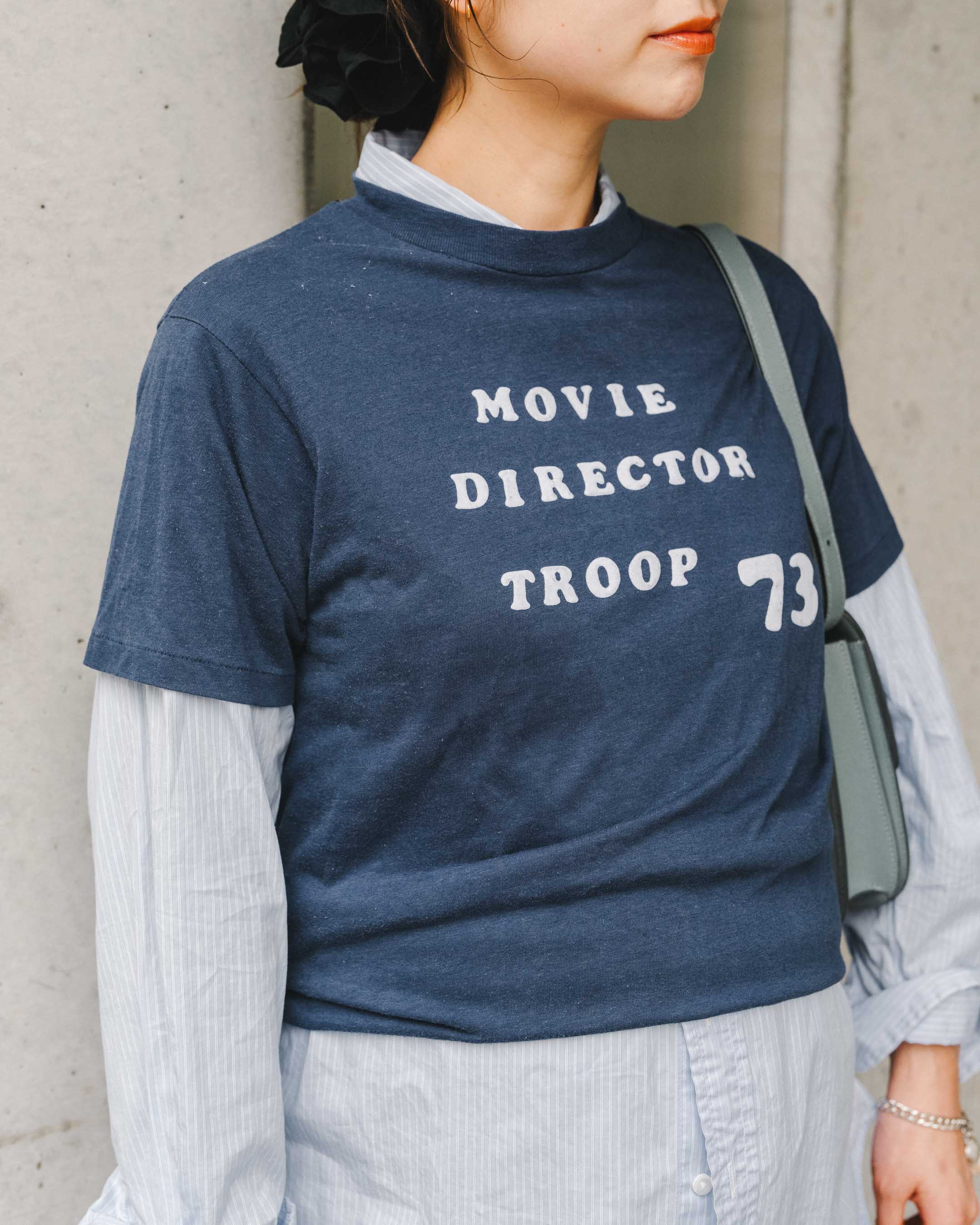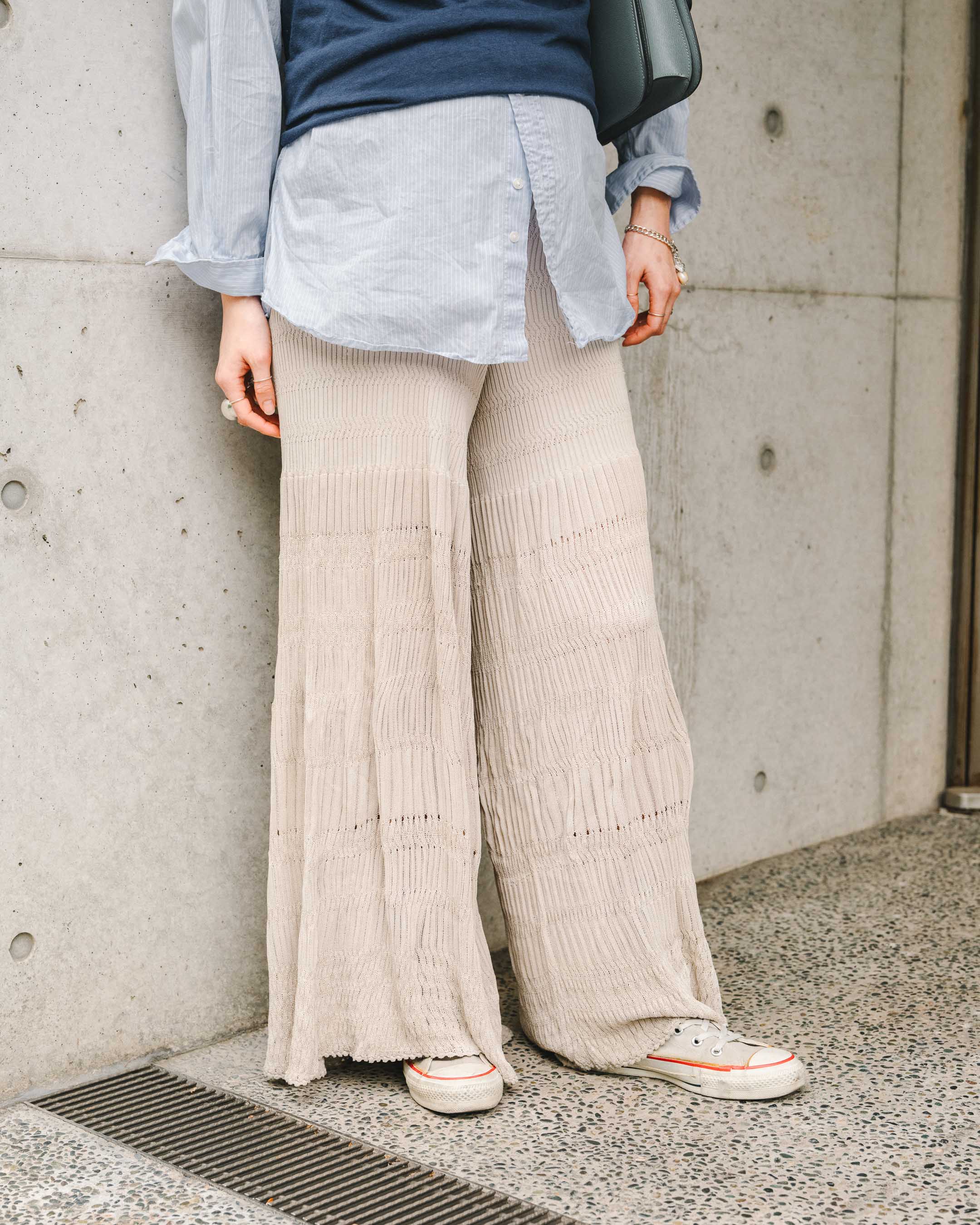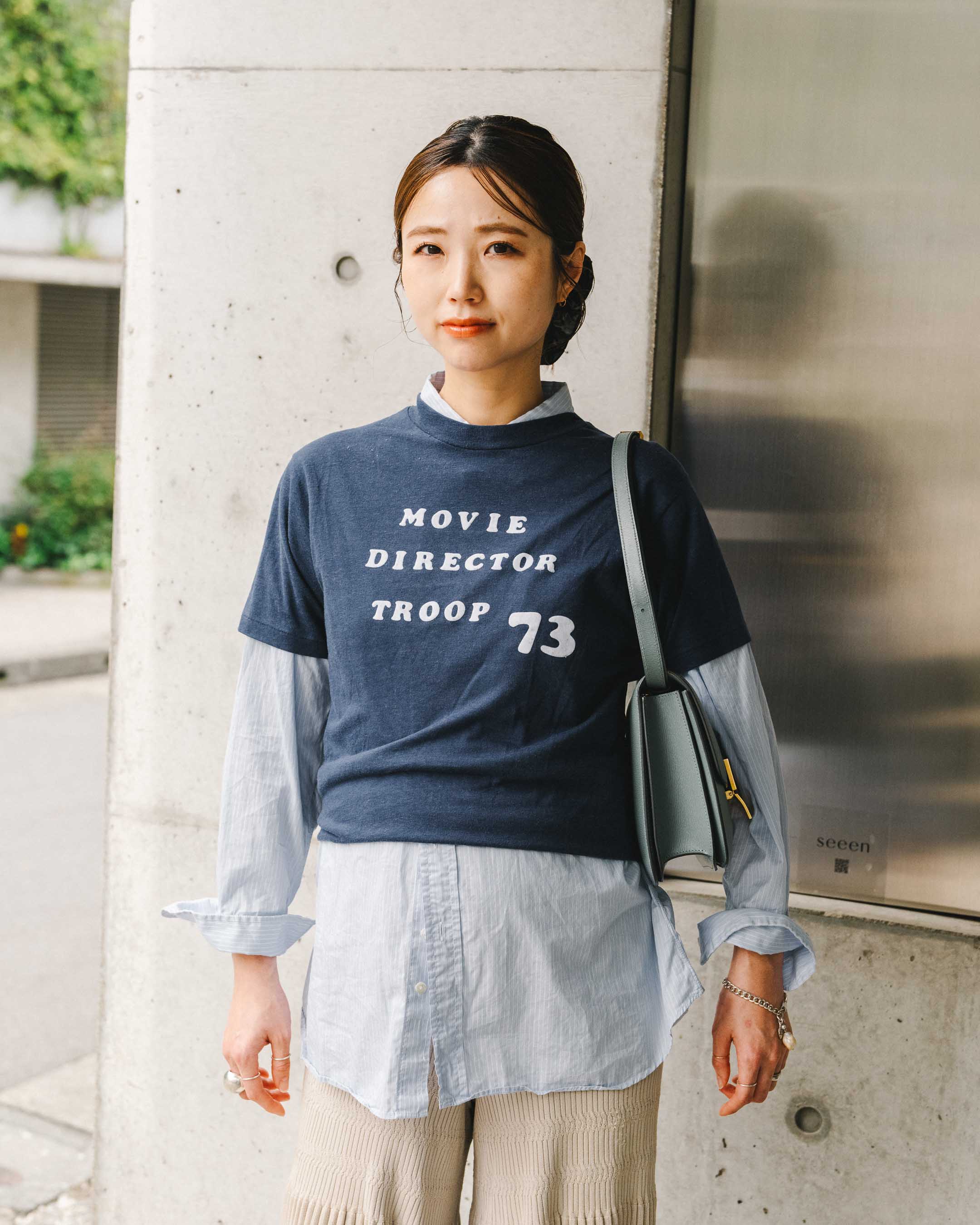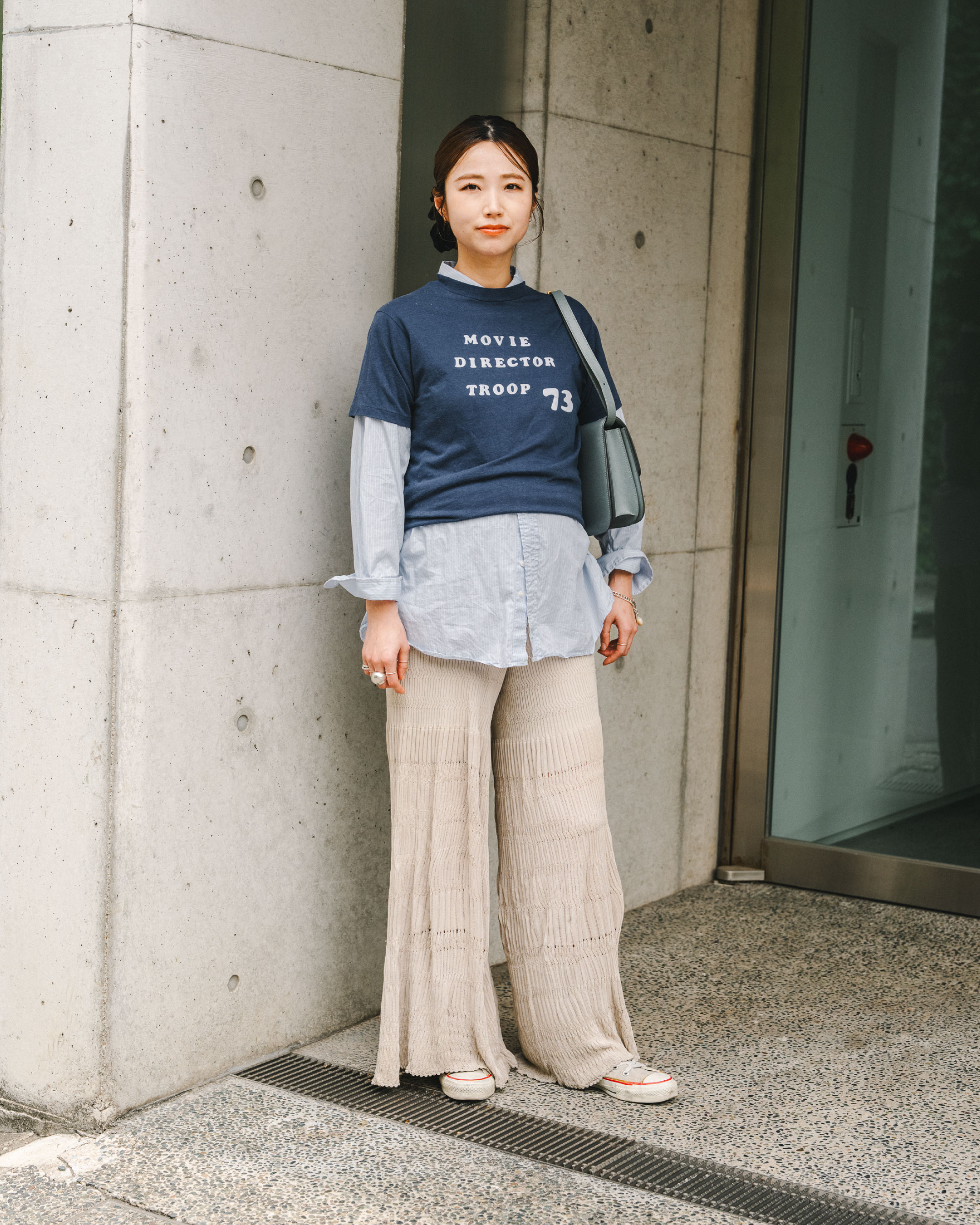 シャツをメインに、淡いトーンで少しリラックス感のあるコーディネートに仕上げる。